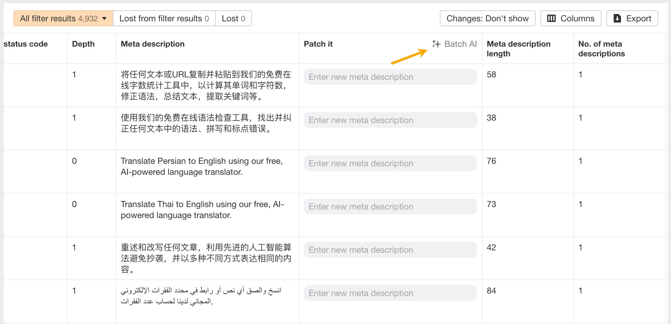 Maintenant, tu peux l’appliquer sur plusieurs pages en même temps. Il te suffit de chercher la fonction Batch AI dans tes rapports d’erreurs.