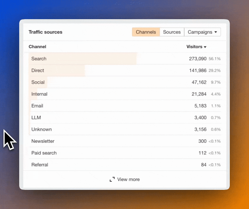 Découvre quels canaux apportent le plus de trafic : Search, Direct, LLM, Email, Newsletter, etc.