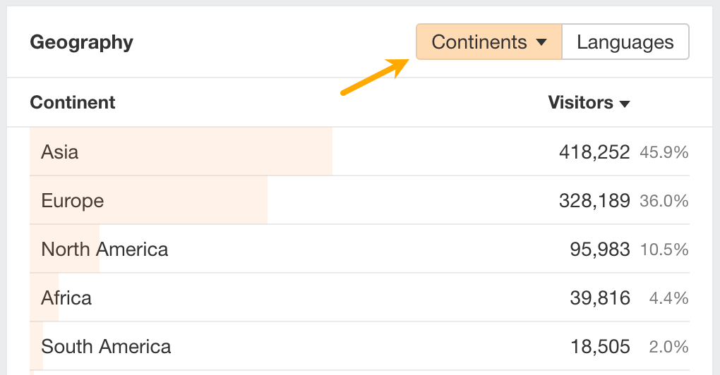 Sélectionne « Continents » dans le widget Geography pour comparer, par exemple, le trafic entre l’Amérique du Nord et l’Europe.