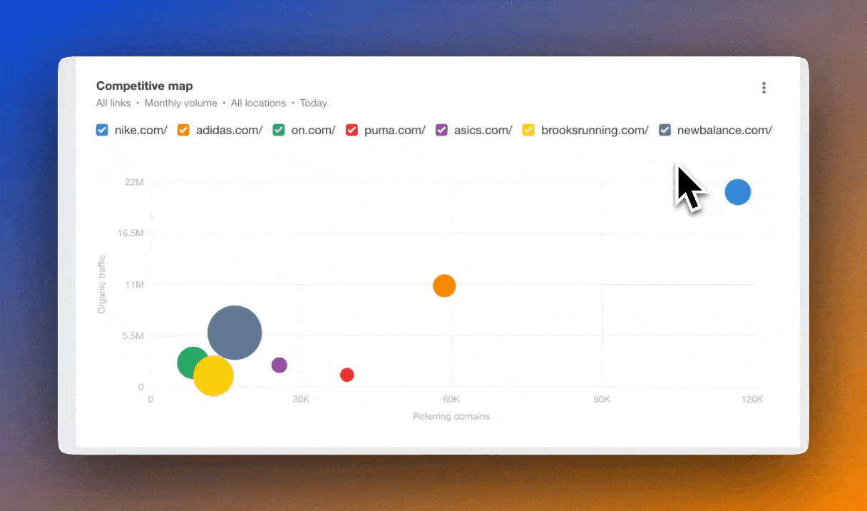 Il te suffit de sélectionner tes concurrents et de personnaliser ta comparaison sur trois axes pour construire ta carte. Choisis parmi les indicateurs clés de backlinks, organique et payants.