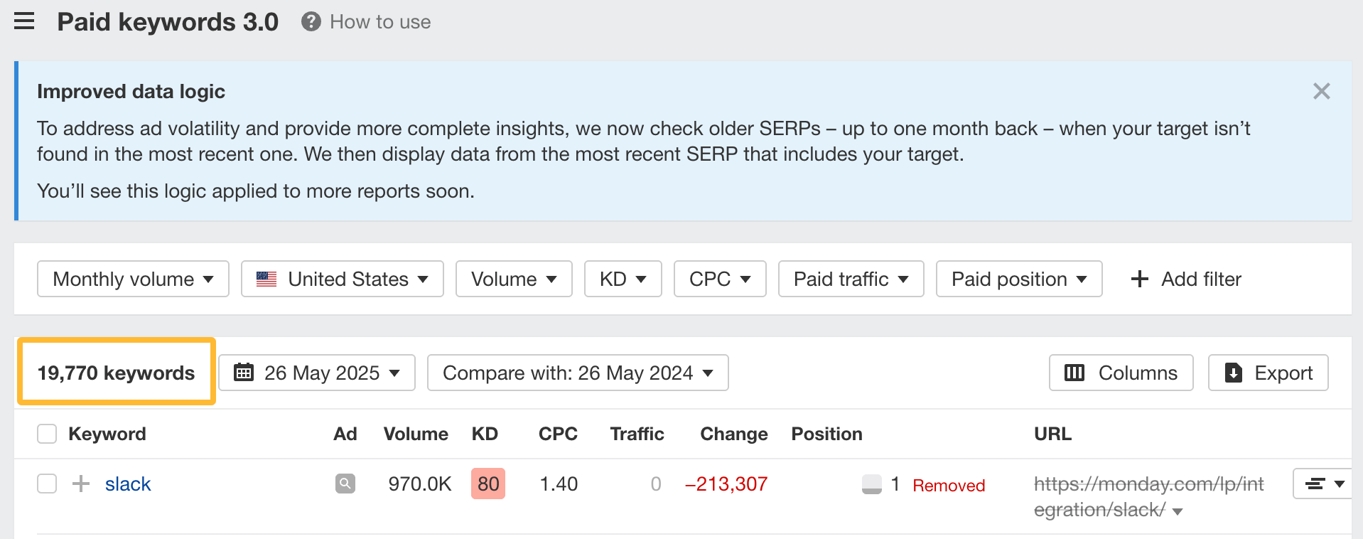 Voici un exemple concret : pour monday.com aux États-Unis, l’ancien rapport recensait environ 9,9k mots-clés payants.
