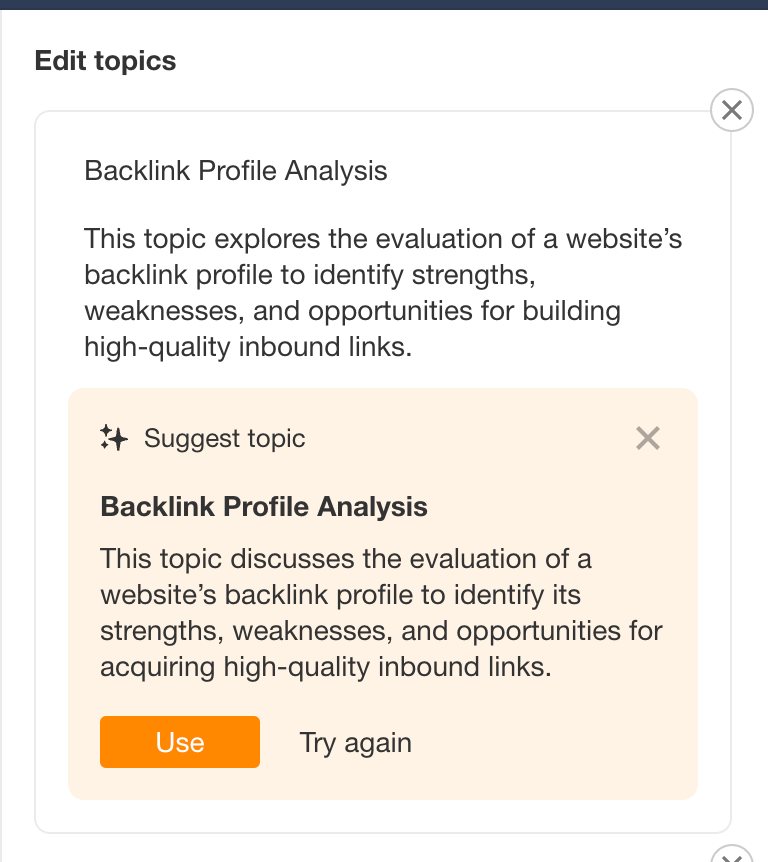 Besoin d’idées ? Cliquez simplement sur « Ask AI » pour générer instantanément des suggestions pertinentes afin d’élargir votre couverture et renforcer la profondeur thématique.