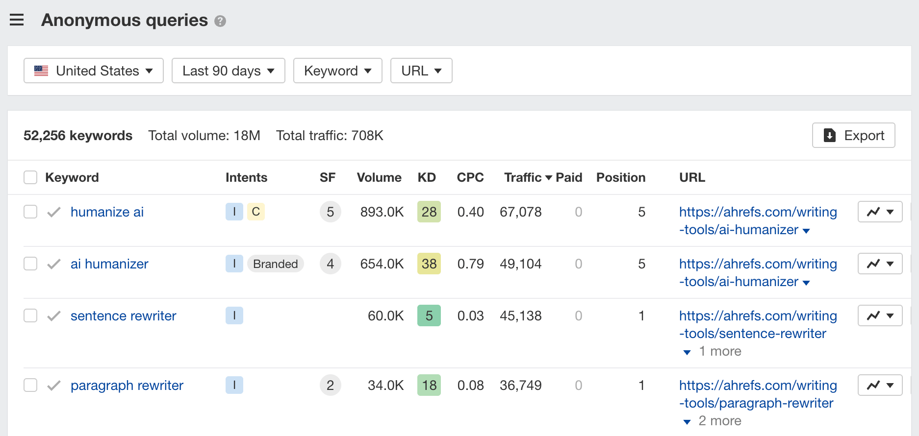 Désormais, vous pouvez les révéler. Dans le nouveau rapport Requêtes anonymes, nous croisons les données GSC avec notre rapport Mots-clés organiques pour dévoiler ces termes cachés, accompagnés de statistiques de trafic, de volume et de répartition par pays. Vous bénéficiez ainsi d’une visibilité sur la longue traîne que GSC ne fournit pas, mais que notre outil vous offre.