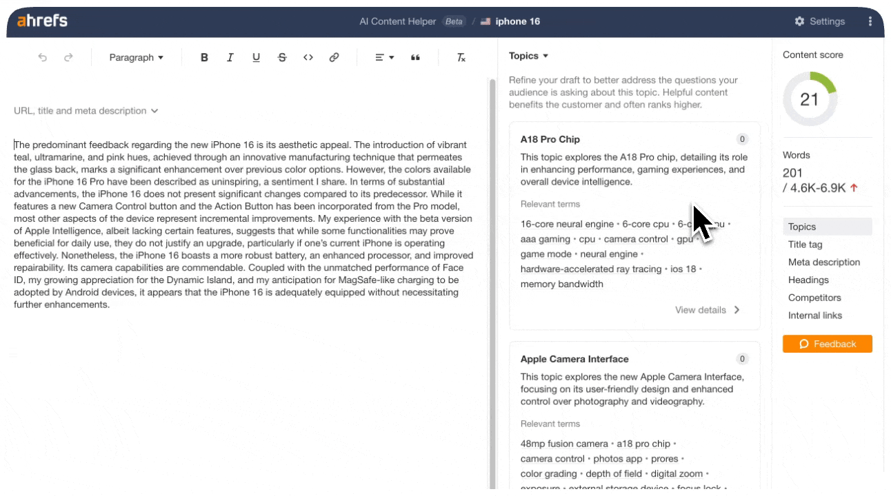 L’outil AI Content Helper d’Ahrefs est maintenant disponible en version bêta ! Il optimise votre contenu en s’appuyant sur les données de vos concurrents pour guider votre processus de rédaction, au lieu de se concentrer uniquement sur l’intégration de mots-clés.