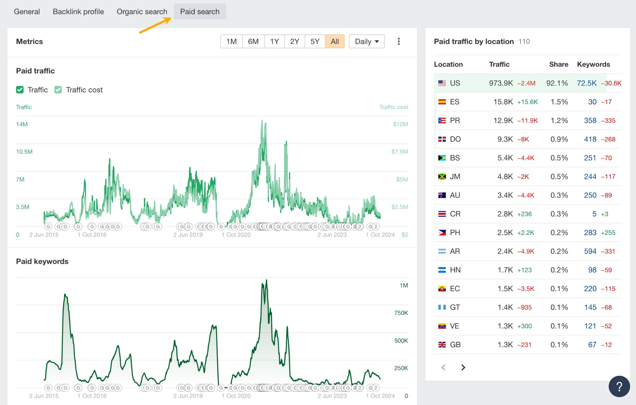 Dans Overview 2.0, vous trouverez un nouvel onglet dédié à la recherche payante, où vous pouvez voir des graphiques pour des métriques telles que :