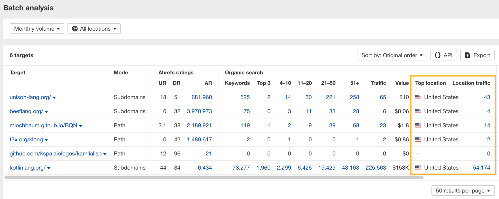 Cela vous donne une meilleure idée du potentiel total d’un mot-clé, au lieu de vous baser uniquement sur le trafic d’une seule page dans un seul pays.