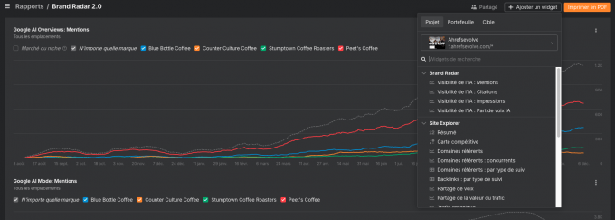 Ajoutez les graphiques Brand Radar 2.0 Mentions pour toutes les plateformes dans vos rapports personnalisés.