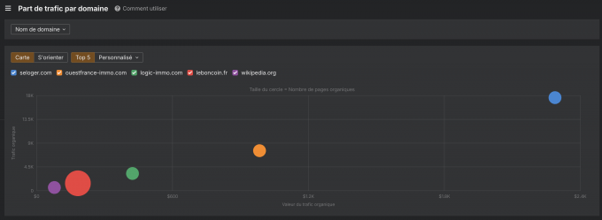 La taille des bulles indique la visibilité : pages pour les domaines, et mots-clés positionnés pour les pages.