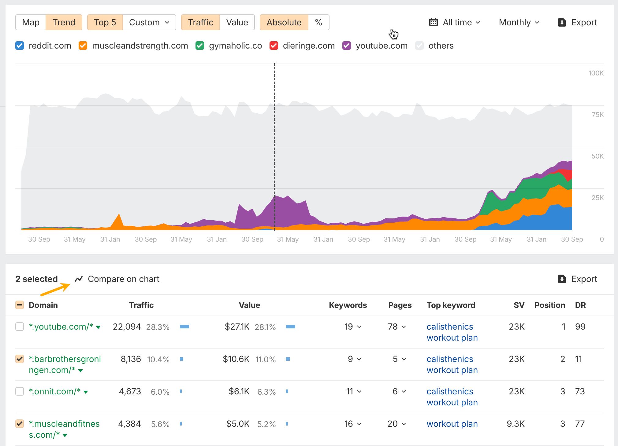 Cliquez sur n’importe quel point pour zoomer, puis sélectionnez des pages à tracer directement pour suivre l’évolution concurrentielle en détail.