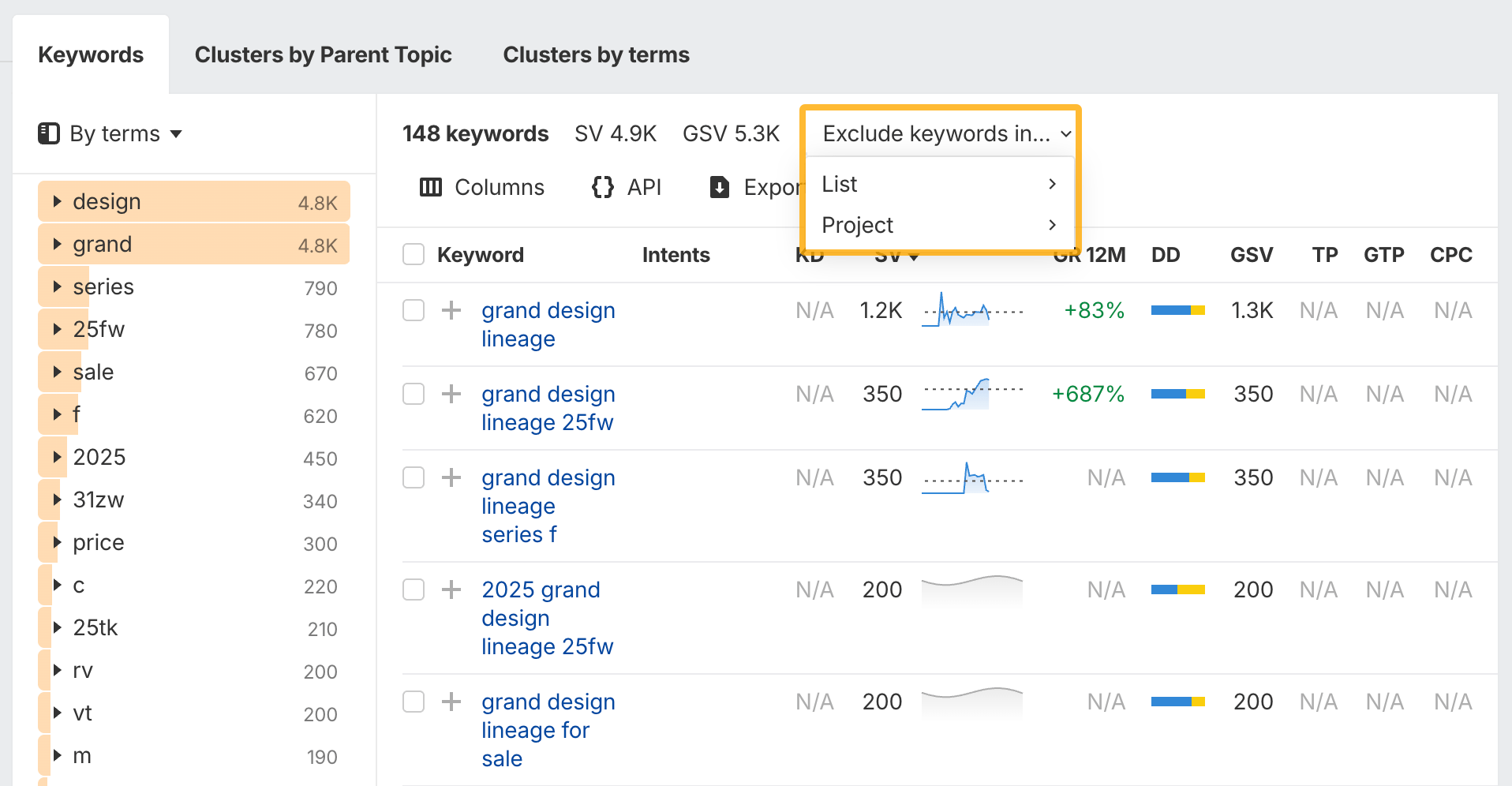 Vous pouvez maintenant exclure les mots-clés déjà présents dans une liste ou un projet depuis les rapports d’idées de mots-clés.