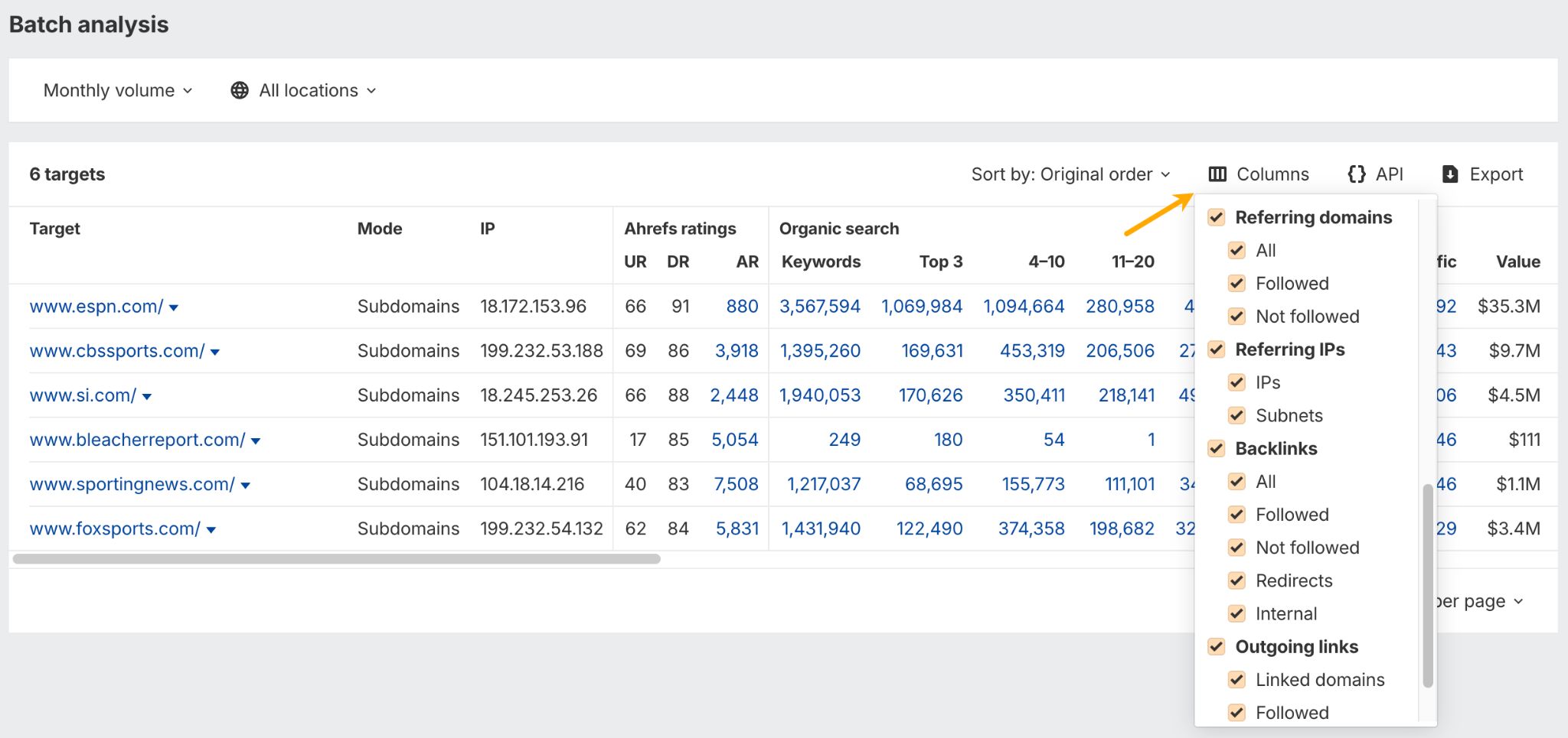 Vous pouvez également exporter les événements trackés directement, ce qui facilite leur analyse en dehors d’Ahrefs.