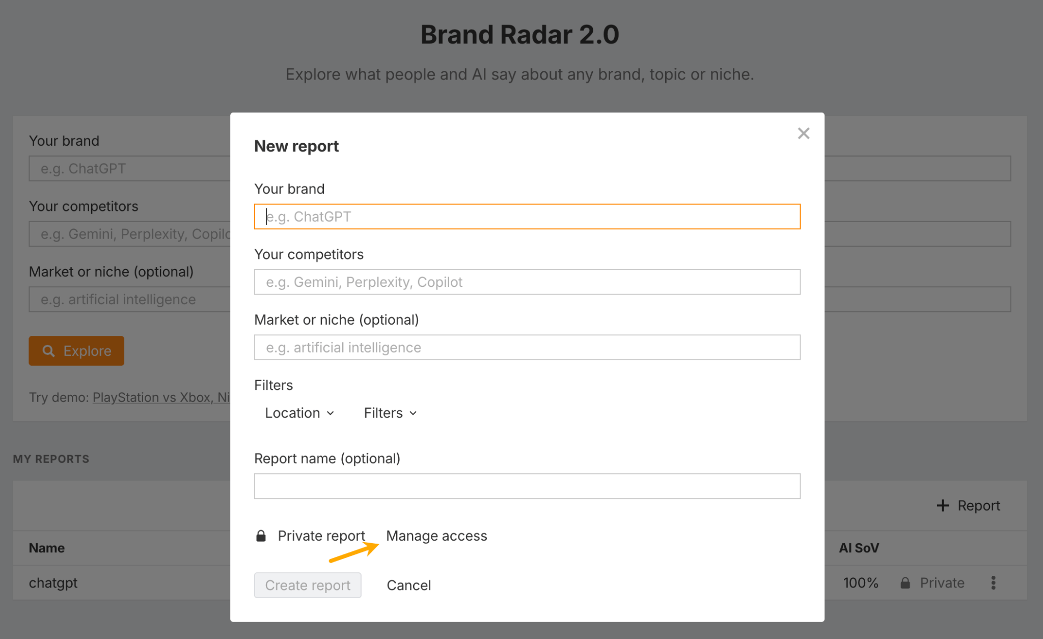 Les rapports pour votre marque, vos concurrents et votre marché peuvent maintenant être enregistrés directement dans Brand Radar. Le contrôle d’accès est intégré : gardez-les privés ou partagez-les avec votre équipe.