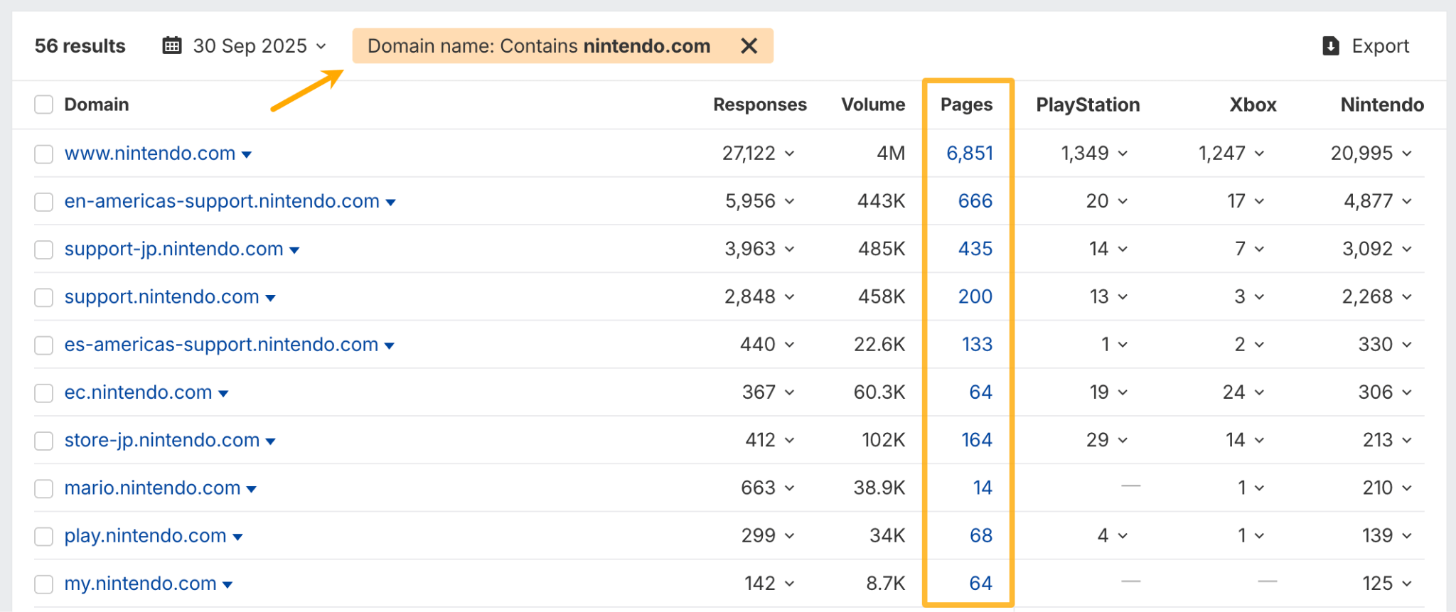 De plus, le rapport Domaines cités possède une nouvelle colonne indiquant le nombre total de pages citées par domaine. Idéal pour repérer où la visibilité est la plus concentrée.