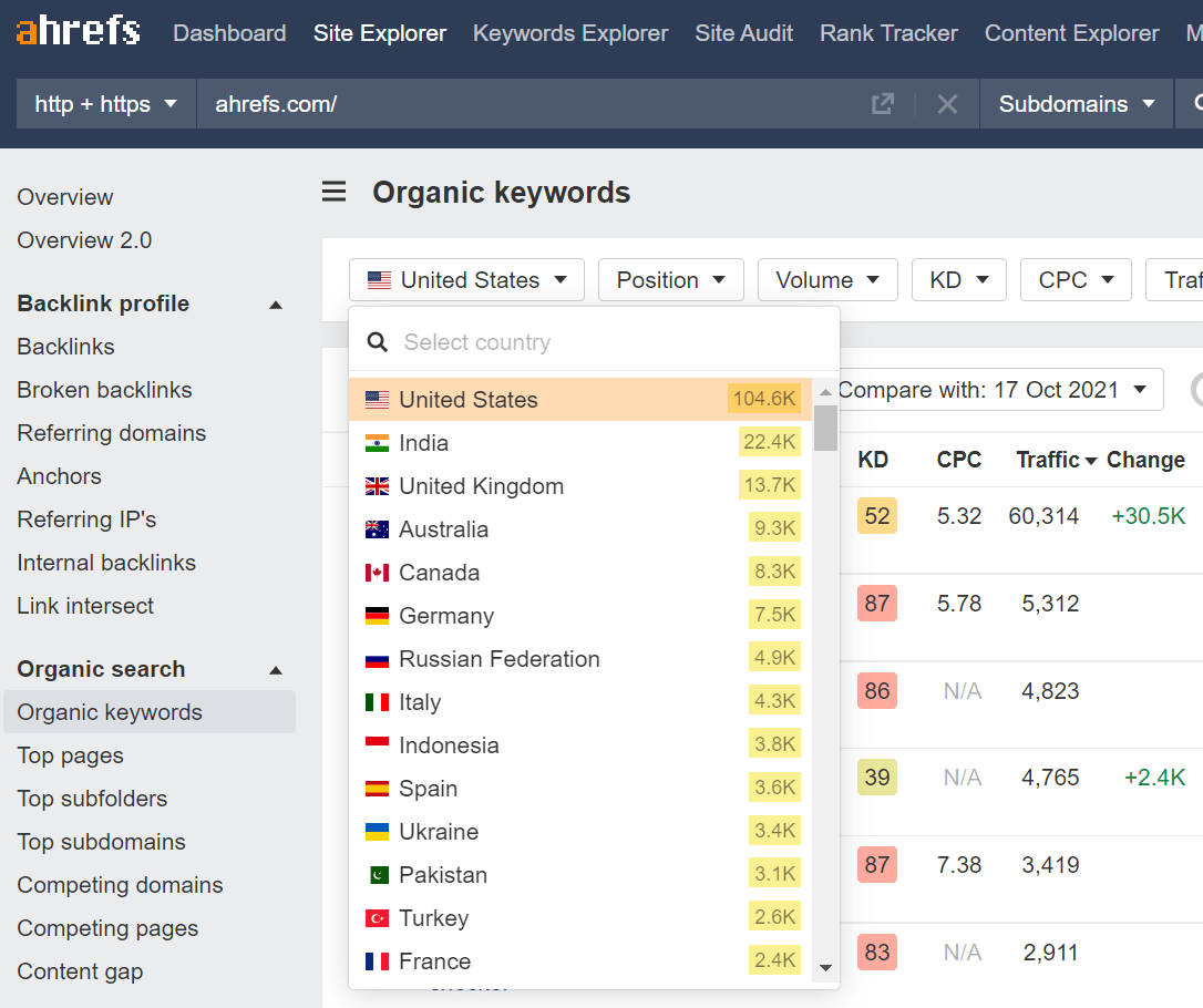 Si nous faisons cela avec l’Explorateur de mots-clés Ahrefs, vous pouvez simplement mettre votre nom de marque et obtenir instantanément :