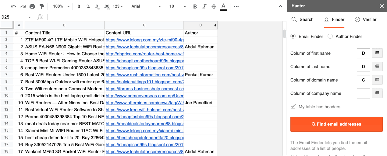 Imaginons que vous ayez exporté quelques prospects de l’Explorateur de contenu puis importé le tout dans Google Sheets. Vous remarquerez que les fichiers d’export incluent le nom d’auteur associé (lorsque nous pouvons le trouver).