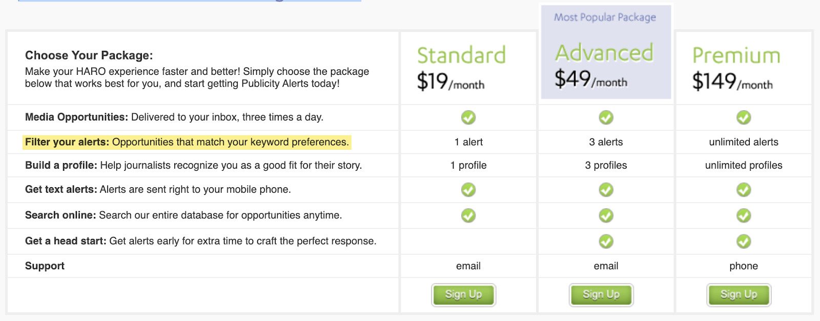 Haro propose une solution via ses abonnements payants qui permet à l’utilisateur de filtrer les opportunités par mots-clés :