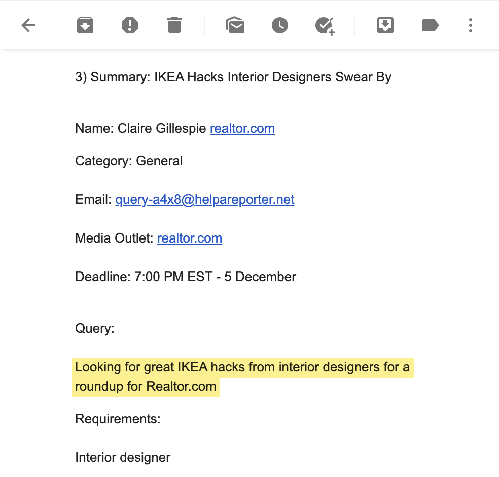 Par exemple, voici une demande récente de Realtor.com (DR91) cherchant de “super idées pour utiliser IKEA pour du design d’intérieur” pour un tour d’horizon :