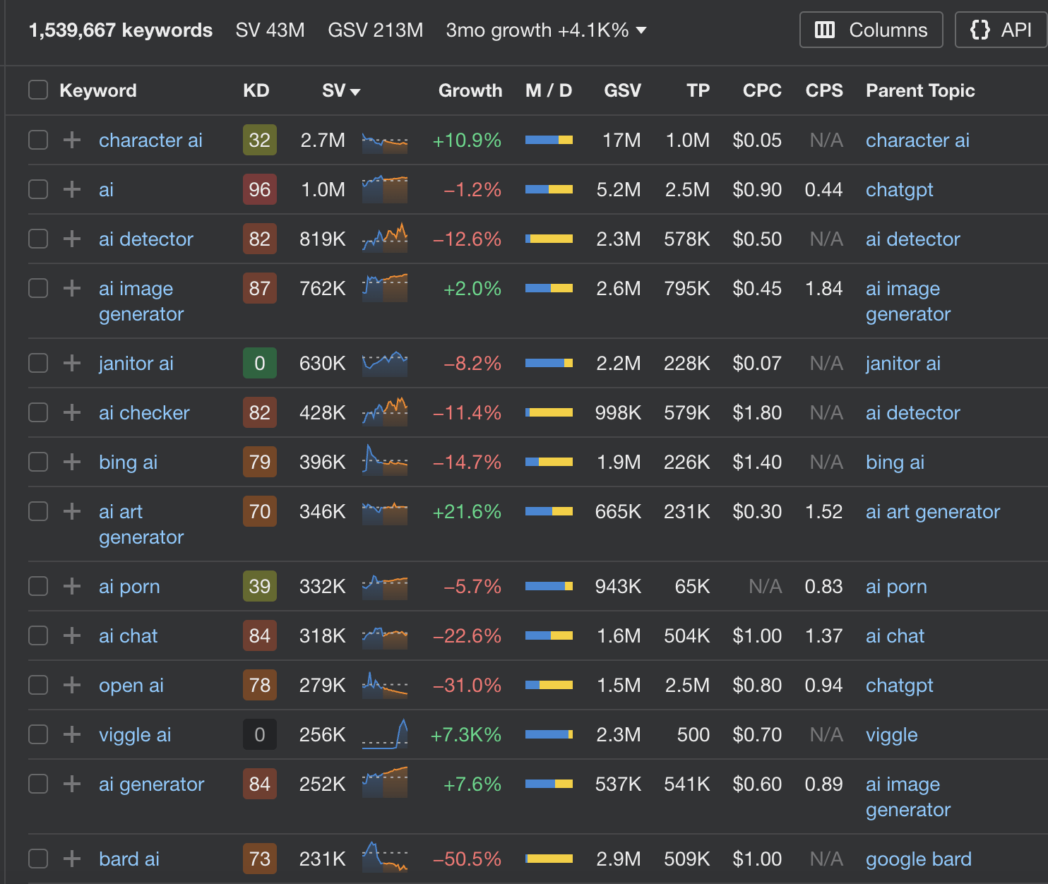 Sachez également qu’il est désormais possible de voir la croissance par mot-clé au fil du temps, directement depuis le Keyword Explorer de Ahrefs.