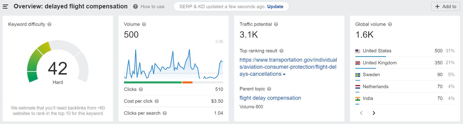 Imaginons que votre startup veuille proposer une solution en ligne pour la compensation en cas de vol retardé ou annulé. Comme ce sera un produit en ligne, on veut savoir à quelle fréquence des utilisateurs font une recherche en lien avec ce problème. Avec l’Explorateur de mots-clés Ahrefs, vous avez l’information en quelques clics.