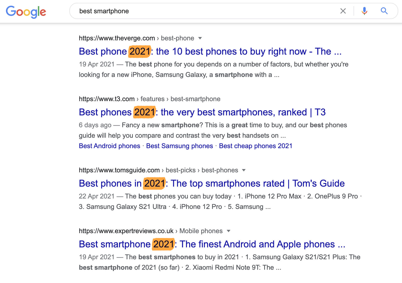 Prenez un mot-clé comme “meilleur smartphone”. Tous les résultats de la recherche ont été publiés récemment.