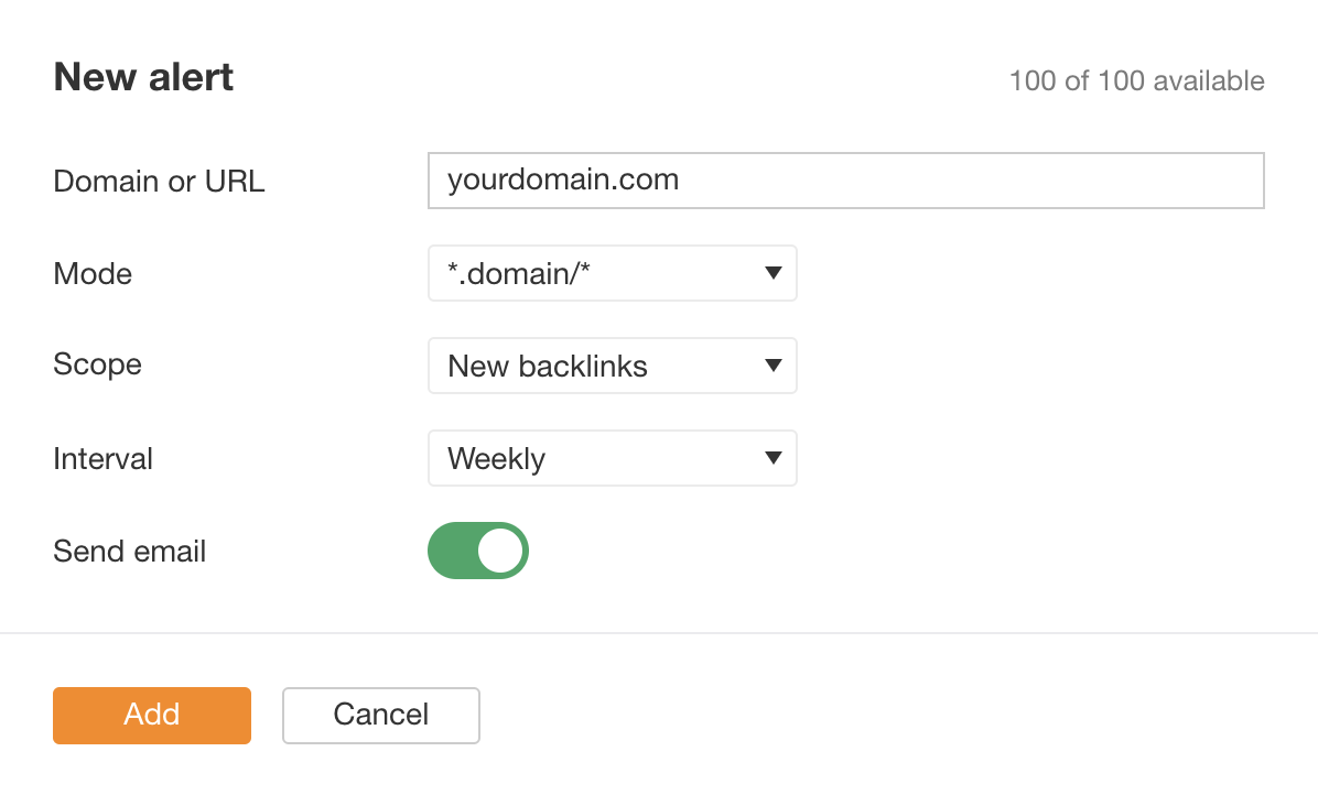 Alerts > Backlinks > New alert > Enter domain > New backlinks > Set email interval > Add