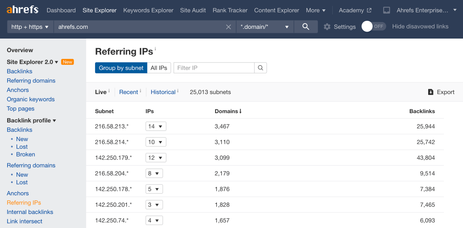 Utilisez les graphiques de domaines et pages référents de l’Explorateur de site de Ahrefs pour rapidement identifier les pics dans votre profil de backlink
