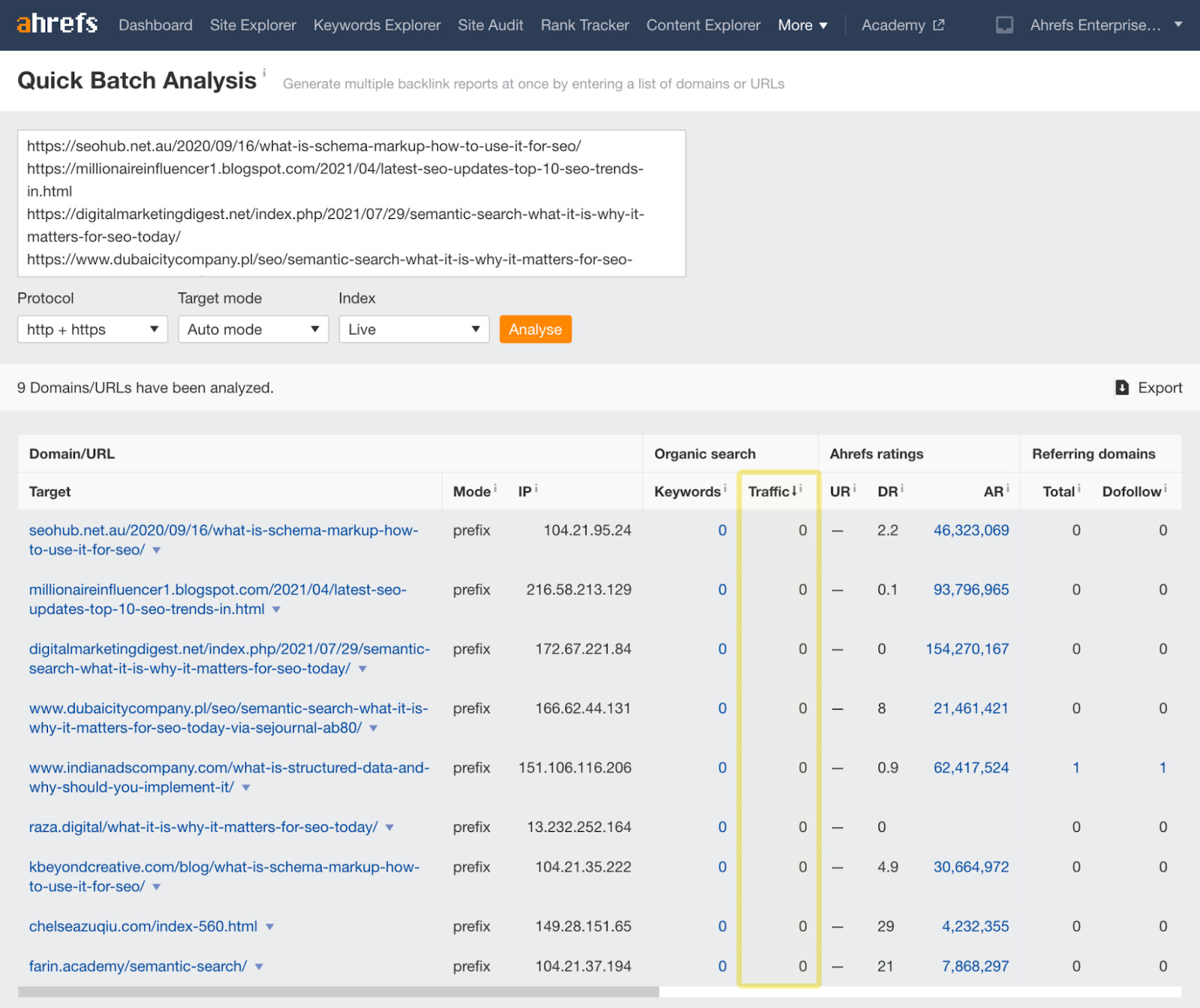 Si vous voyez une liste d’URL externes dupliquées, vous pouvez utiliser l’outil Batch Analysis pour voir si celles-ci reçoivent du trafic. Triez les URL par trafic :