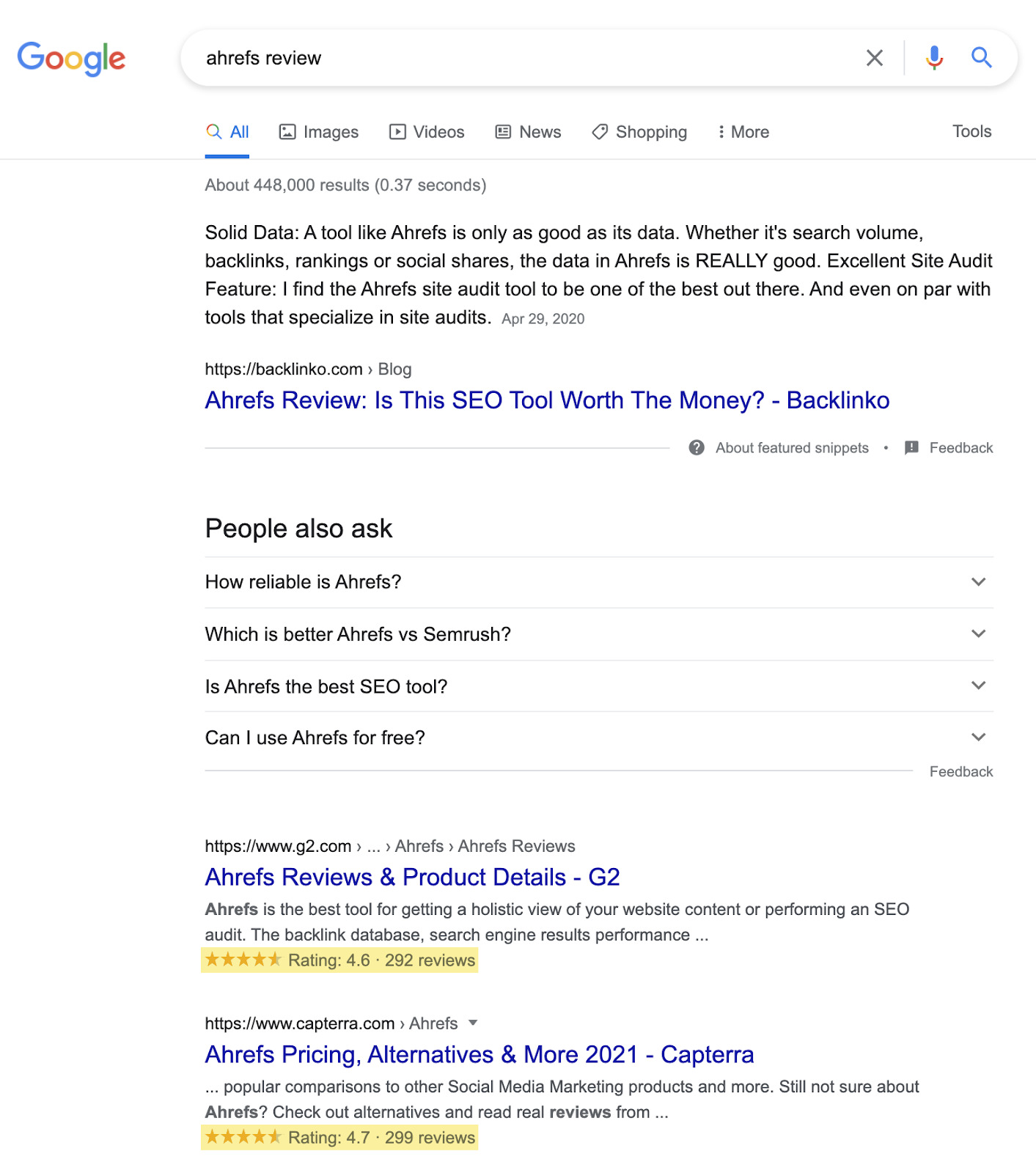 Cela dit, ces plateformes ne sont pas les seules options. Google peut aussi montrer du contenu éditorial qui contient un avis dans ses extraits enrichis.