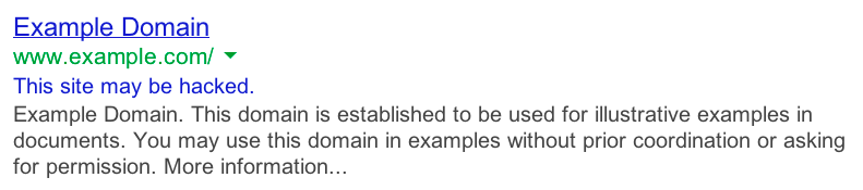 S’il ne vous virent pas directement du SERP, ils pourraient ajouter la mention “ce site peut avoir été piraté” sur tous les résultats de votre site, comme ici :