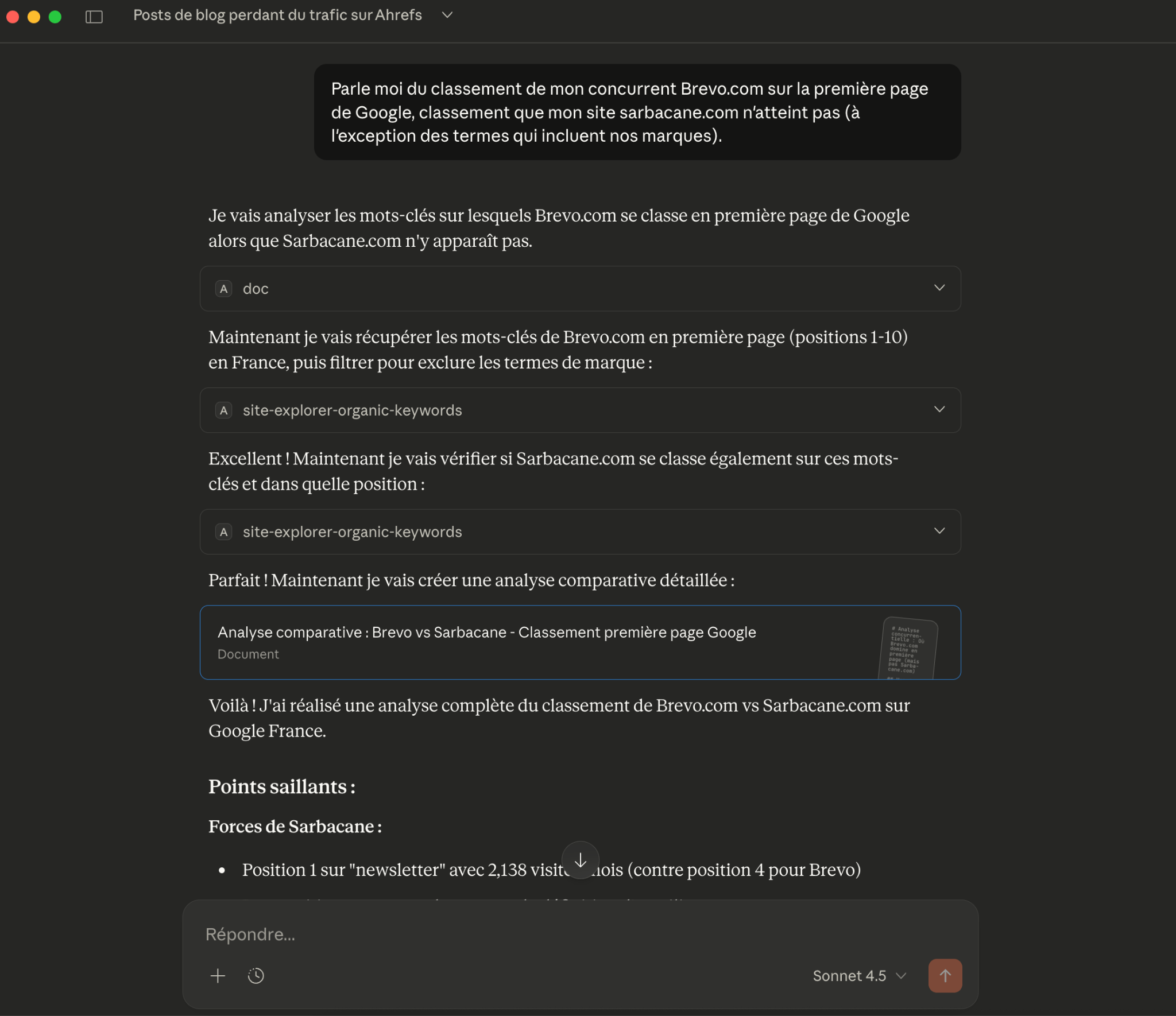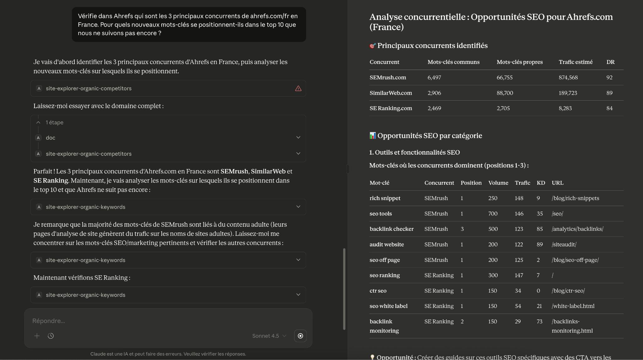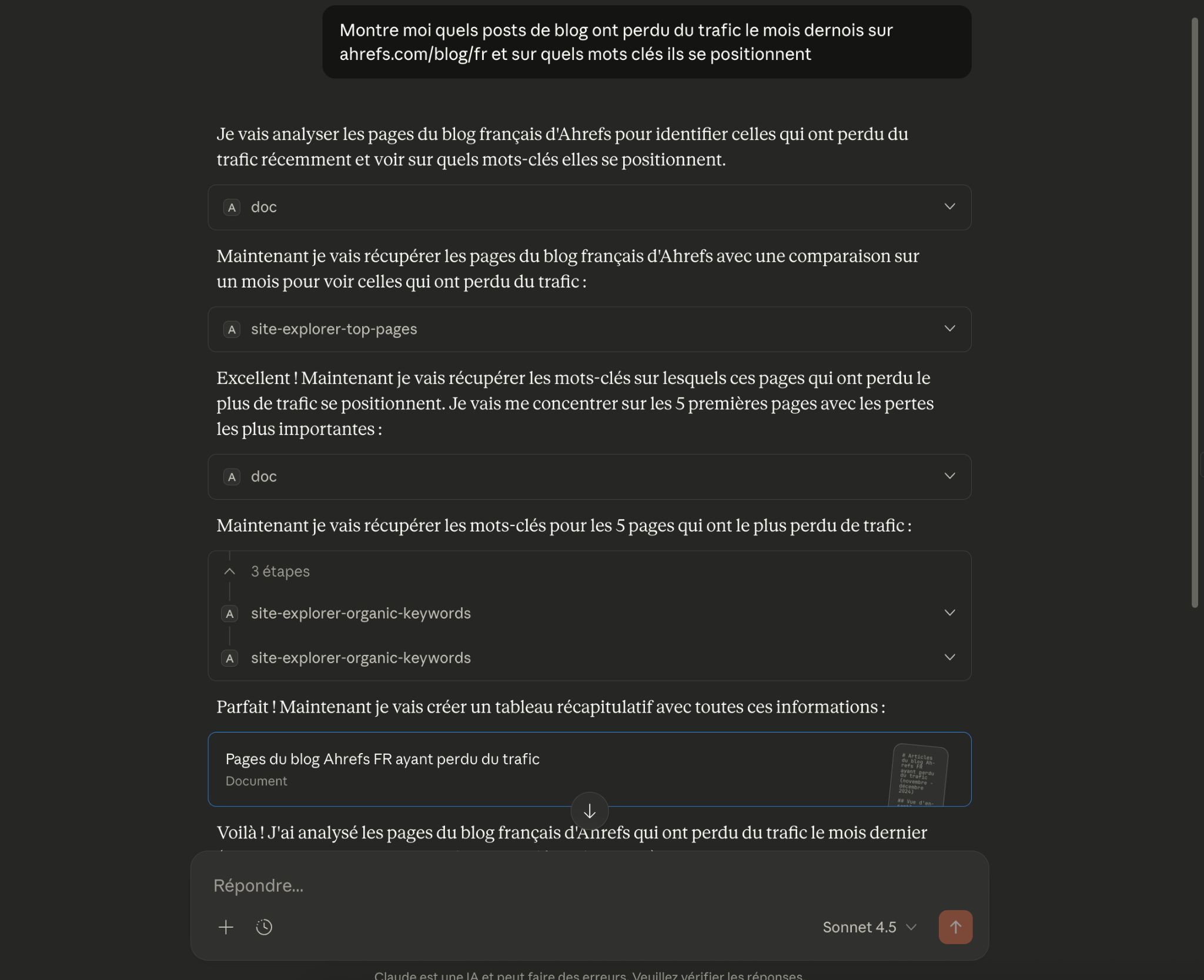 Le LLM récupère automatiquement les données depuis Ahrefs, les analyse et vous fournit un rapport interactif avec lequel vous pouvez échanger.