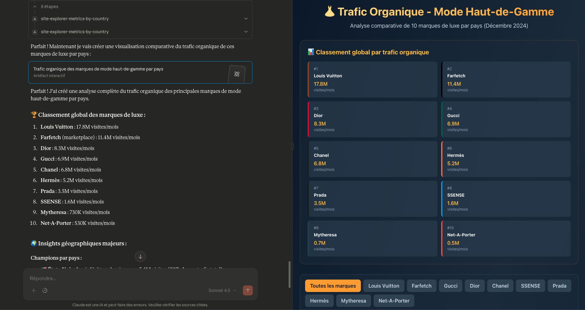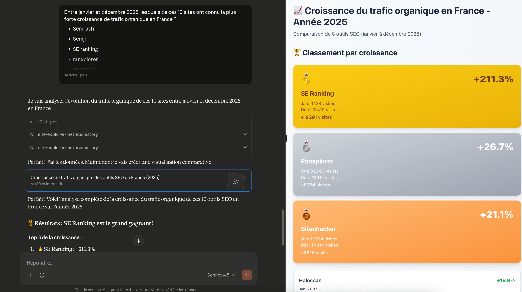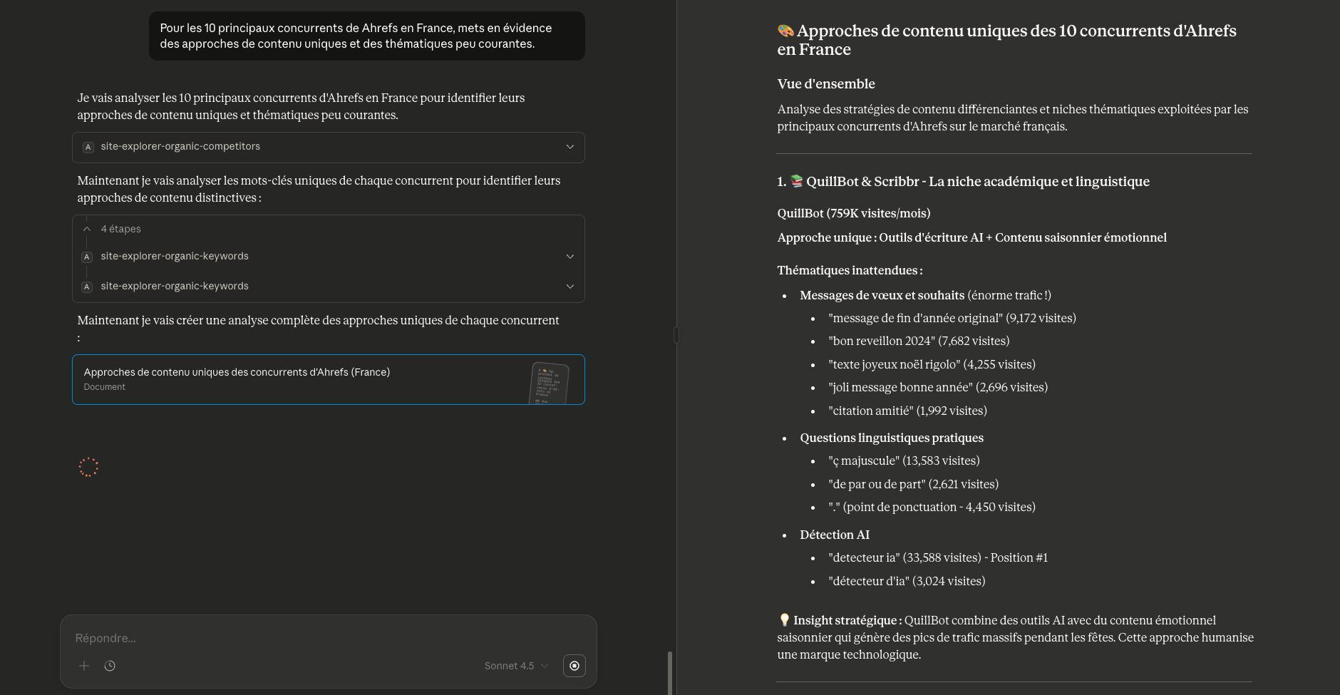 Le LLM récupère automatiquement les données depuis Ahrefs, les analyse et vous fournit un rapport interactif avec lequel vous pouvez échanger.