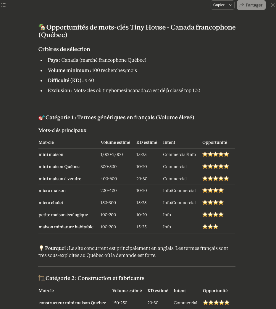 Résultat : une liste claire de mots-clés accompagnés de données SEO et d’idées de titres.