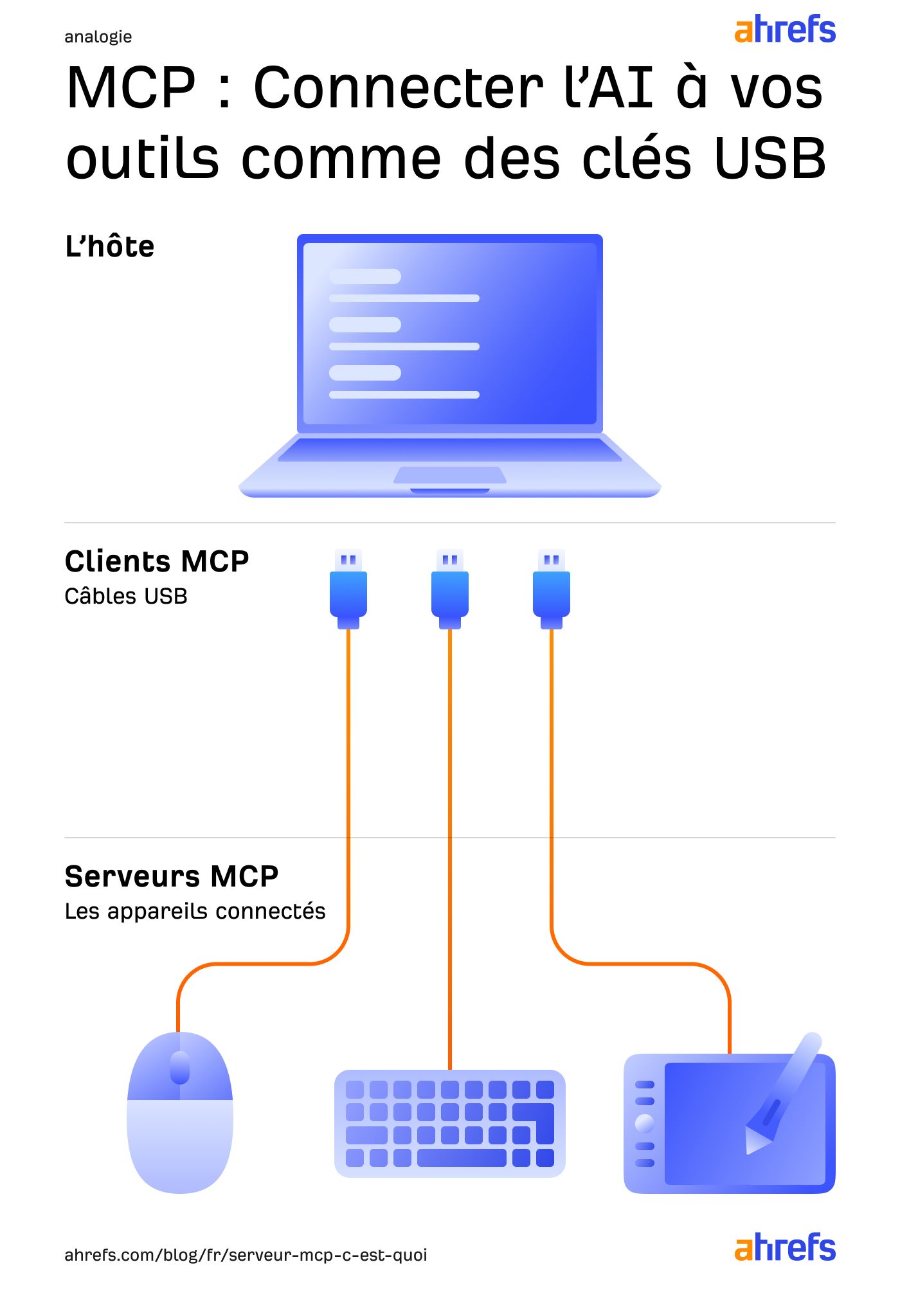 Concrètement, cela signifie que vous pouvez connecter Claude ou ChatGPT à un outil comme Ahrefs et lui indiquer simplement ce dont vous avez besoin, en langage naturel, au lieu de naviguer entre plusieurs applications pour accomplir une tâche.