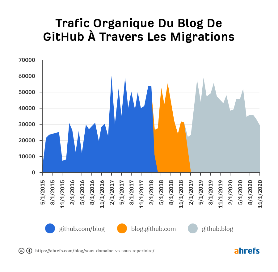 Voici un autre exemple, assez amusant. Github est passé d’un sous-répertoire (github.com/blog) à un sous-domaine (blog.github.com) puis vers un domaine différent (github.blog). Il y a eu des variations pendant les périodes de migration et d’autres changements pendant la transition. Mais il serait difficile d’affirmer que l’une de ces solutions était meilleure que l’autre simplement à cause de l’URL.