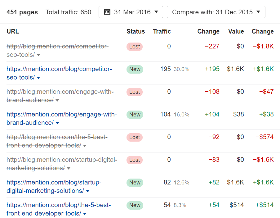 Remarquez de plus que pour chaque page ayant perdu du trafic, une autre équivalente en a regagné à peu près autant. Le flux a simplement changé d’endroit, mais il n’y a pas réellement eu d’augmentation.