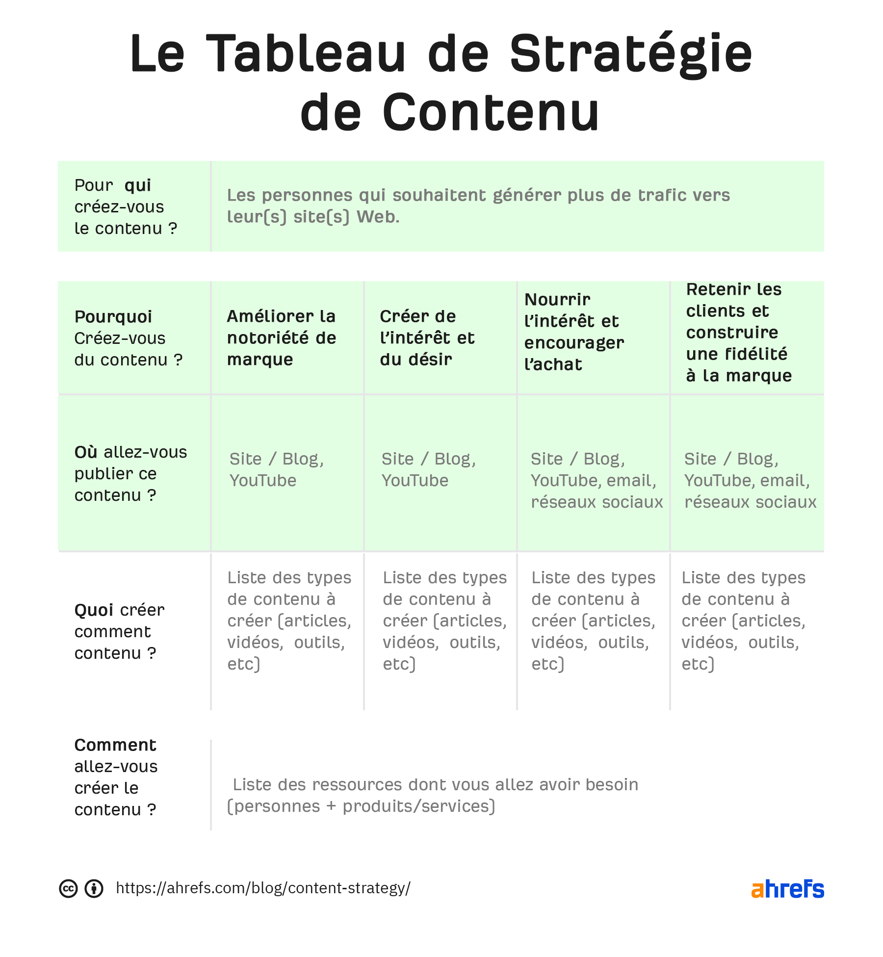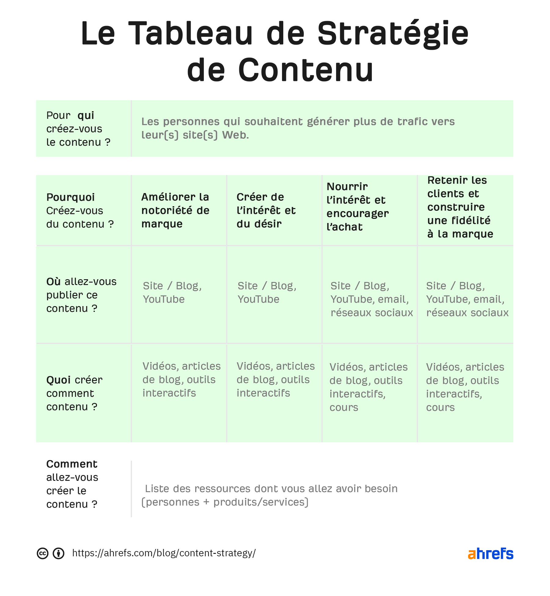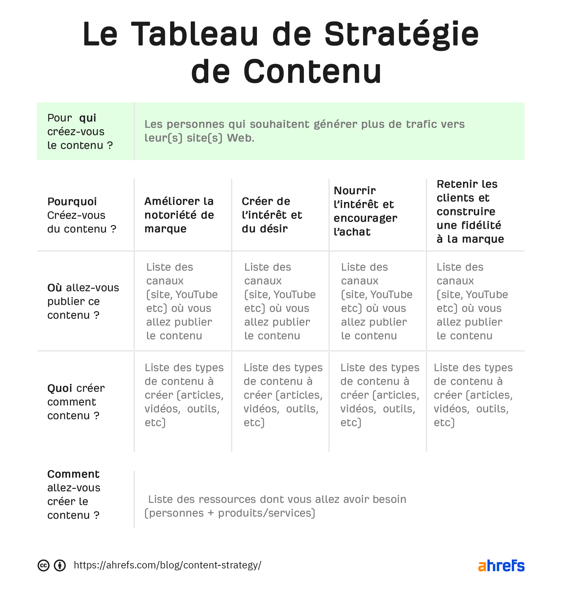 Le but du tableau de stratégie de contenu est de vous aider à créer une stratégie de contenu de base en répondant simplement à cinq questions :