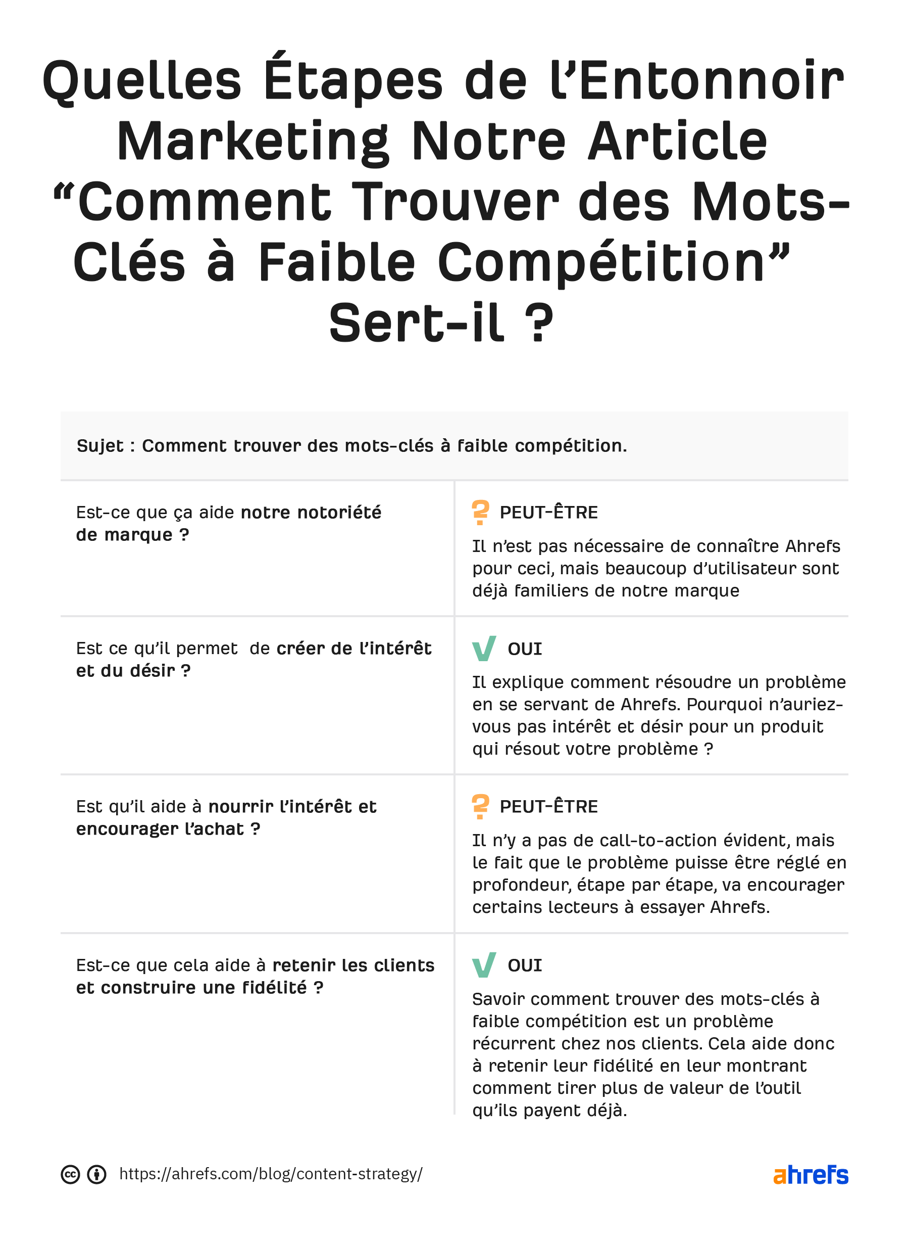 La plupart de nos articles de blog proposent de bons exemples pratiques de cette idée. Prenons le sujet “Comment trouver des mots-clés à faible compétition”. Cet article peut servir différentes étapes de l’entonnoir marketing à différents degrés.