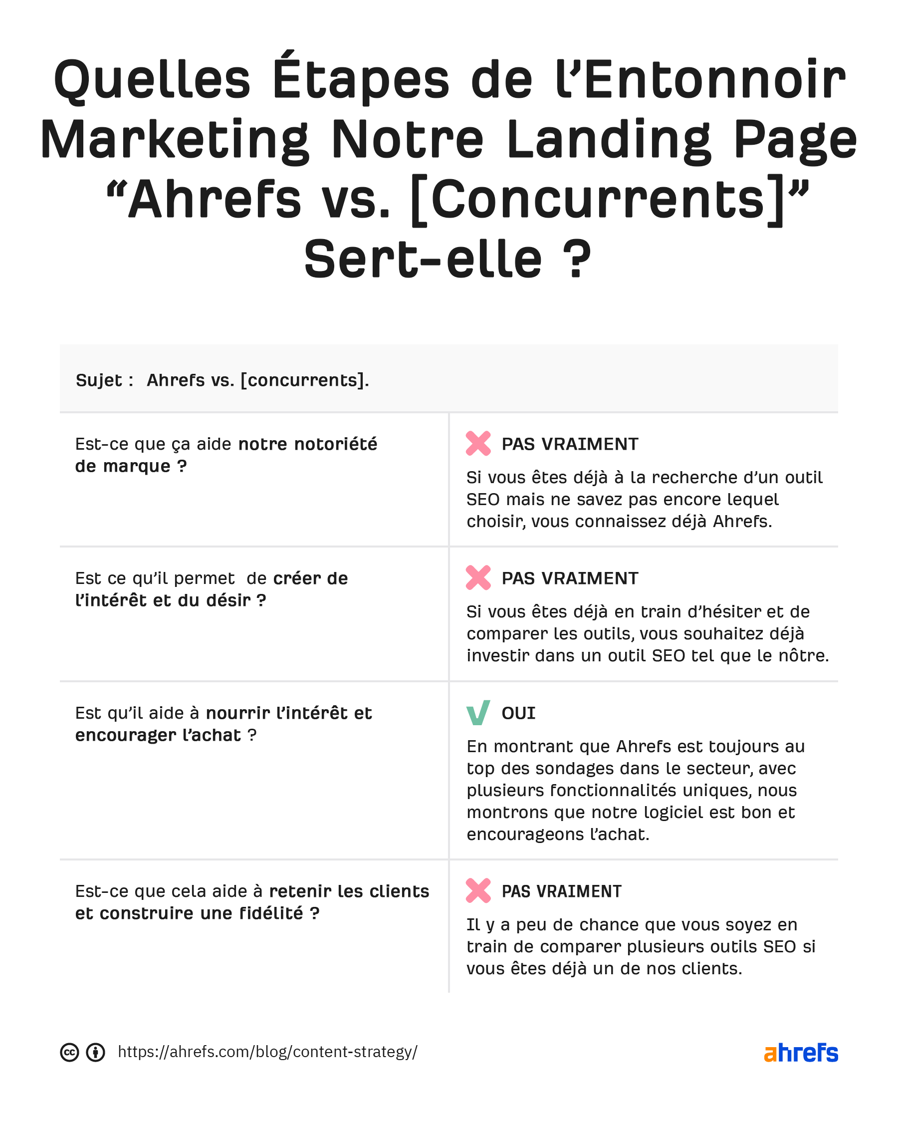 Quoiqu’il en soit, vous verrez que les “pourquoi” sont pré-remplis sur le tableau de stratégie de contenu car vous allez avoir besoin d’en créer pour tous. Après tout, il n’y a pas d’intérêt à avoir une marque connue si personne n’achète, et pas d’intérêt d’attirer des clients si vous n’êtes pas en mesure de les retenir.