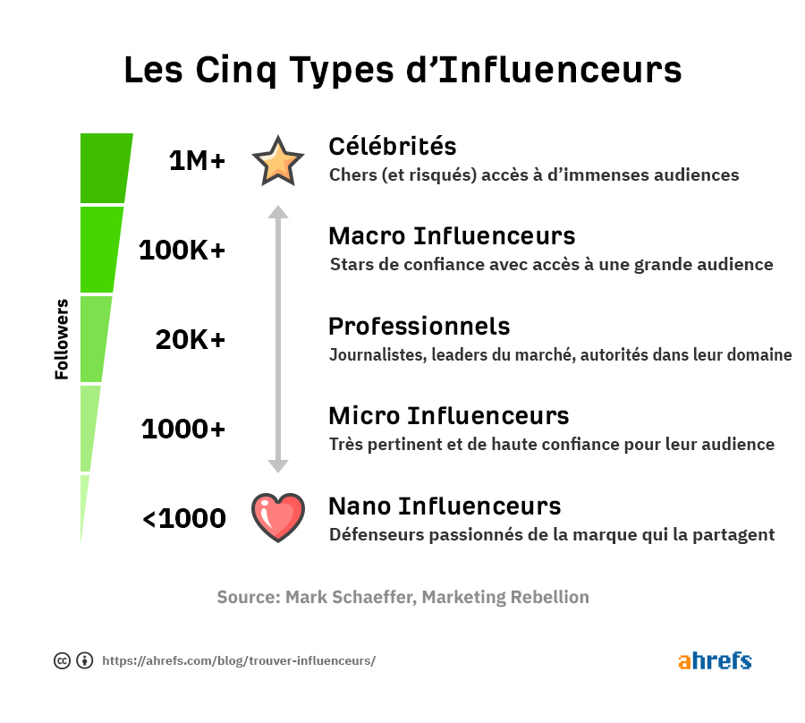 On trouve des influenceurs de toute envergure, du bien nommé micro-influenceur aux véritables célébrités. Voici une échelle mise en forme par l’équipe de Ahrefs à partir de l’ouvrage de Mark Schaeffer : Marketing Rebellion.