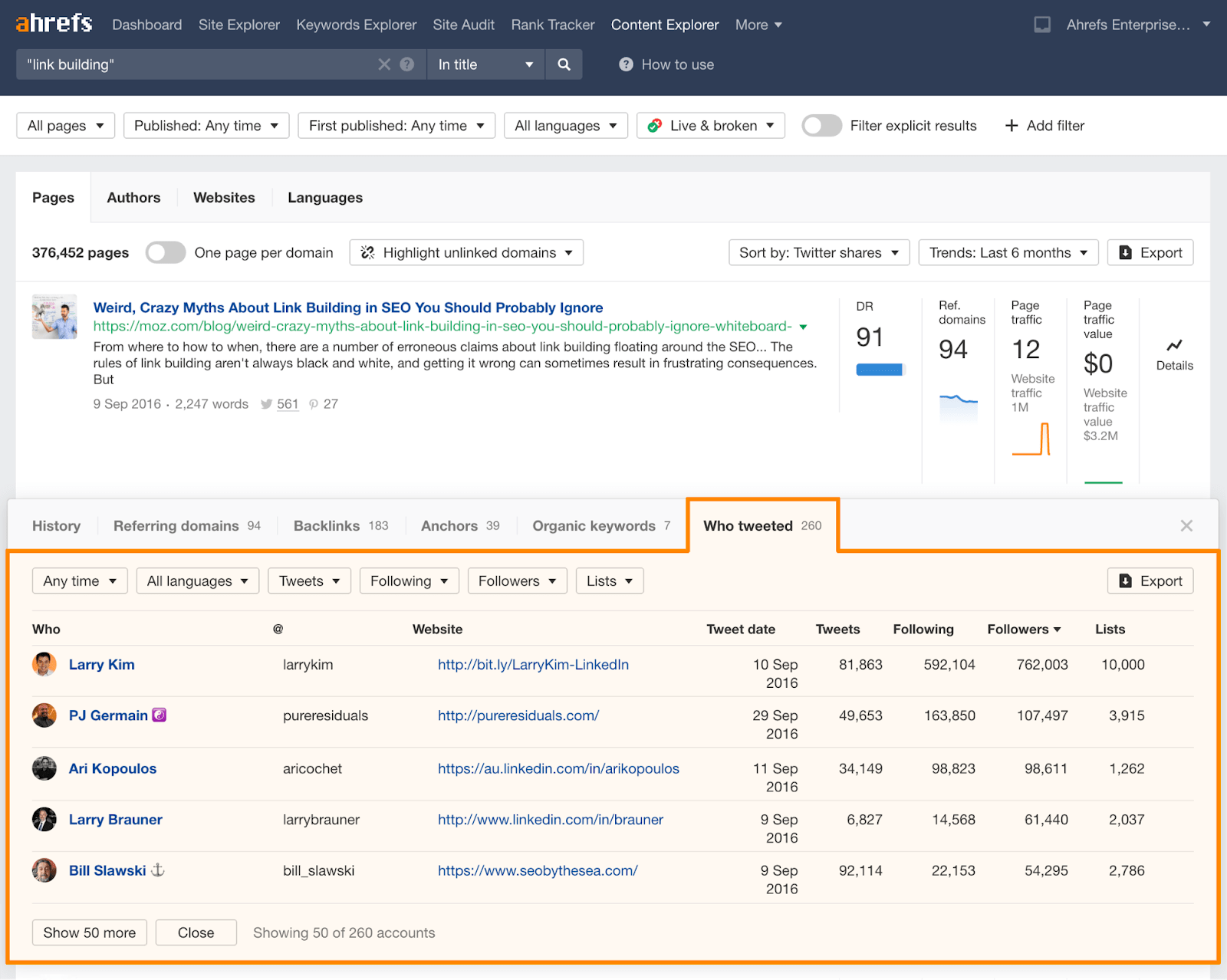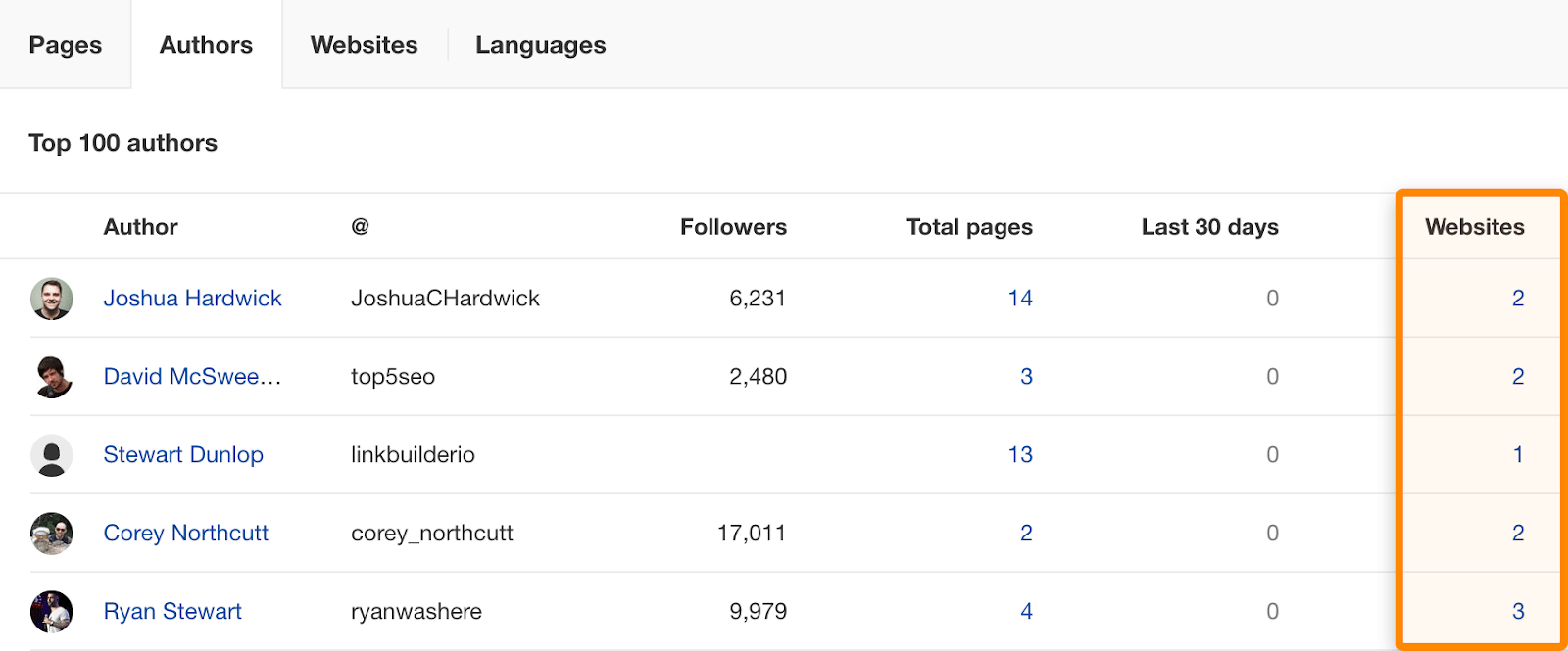 Jetez un œil aux auteurs qui écrivent le plus sur votre sujet. Notre cher Joshua Hardwick a produit le nombre impressionnant de 14 articles qui contiennent « link building » dans le titre. Il y a de grandes chances qu’il soit un expert sur le sujet. Avec plus de 6 000 abonnés Twitter, il a sans doute une audience active.