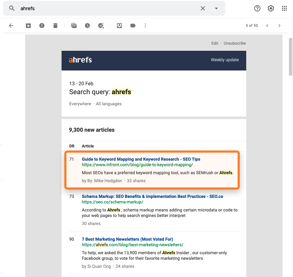 La liste sera triée selon le nombre de partages sur les réseaux sociaux et l’Autorité de Domaine. Examinez les premiers résultats pour voir où vous avez été mentionnés. Si c’était en bien, ajoutez la plateforme sur votre liste. Si c’est en mal, discutez avec l’auteur. Vous obtiendrez de précieux retours d’expérience et aurez une chance de vous rattraper.