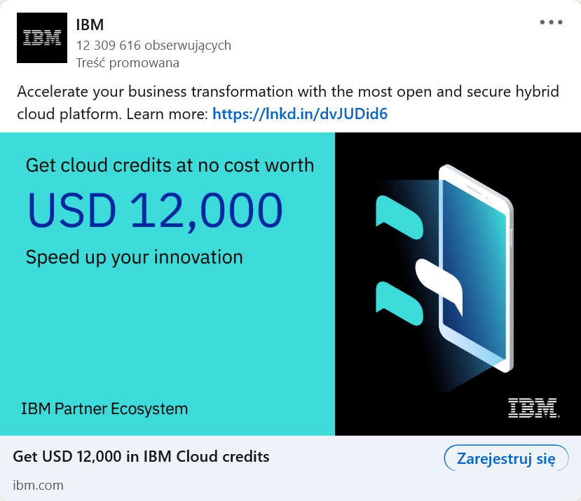 La pub­lic­ité B2B pointe vers un for­mu­laire de cap­ture de lead qui pro­pose des crédits gra­tu­its dans le ser­vice de Cloud d’IBM.