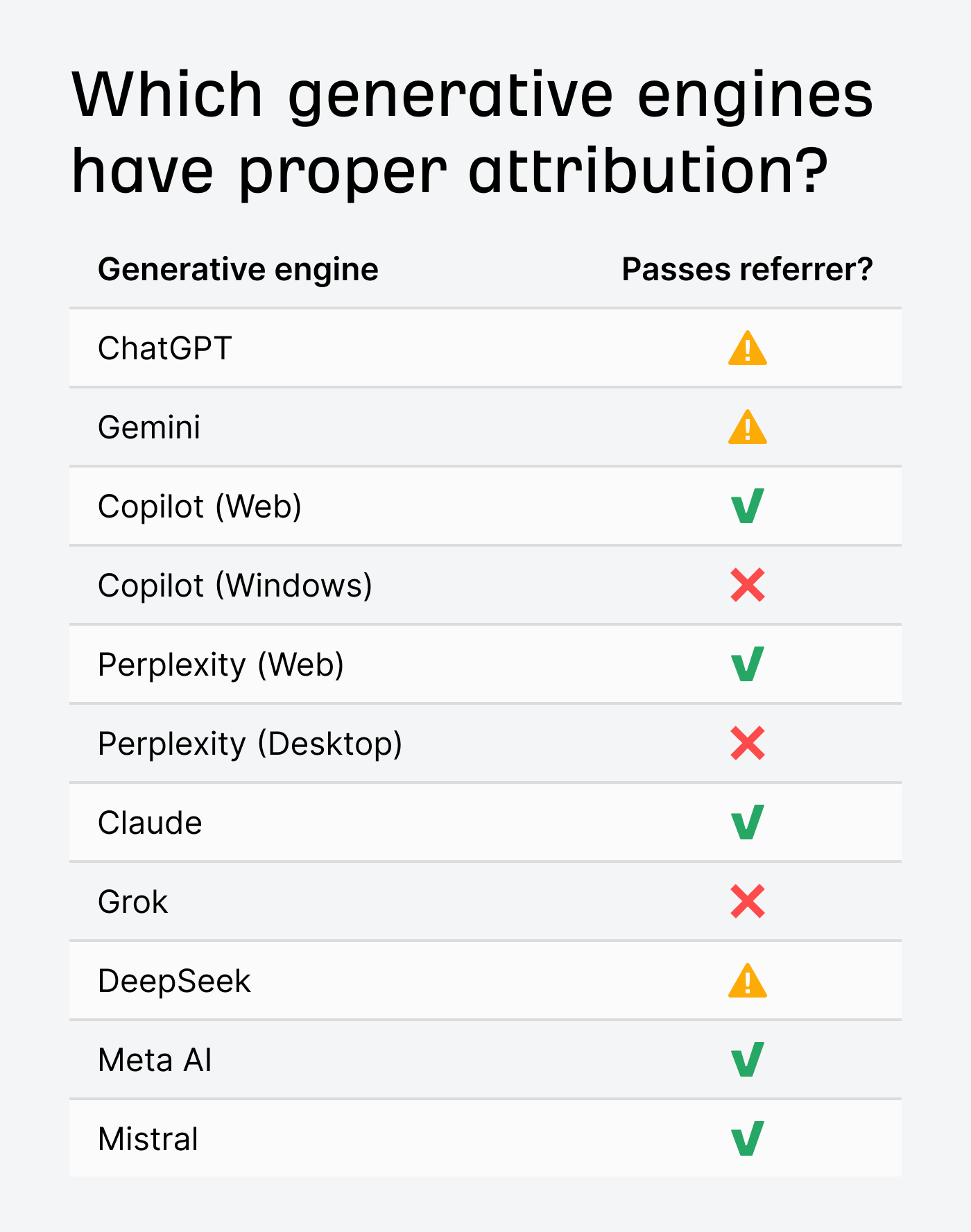 Some of the AI assistants send the referrals, others don’t send them at all, and some send them for certain things and not others. I’ve marked those with a warning to indicate partial results.