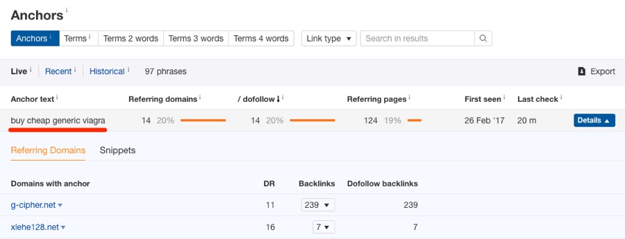 If only a single term or two raises suspicion, you can choose the “Anchors” report and “Details” to see the referring domains and backlinks with the concerning anchor text: