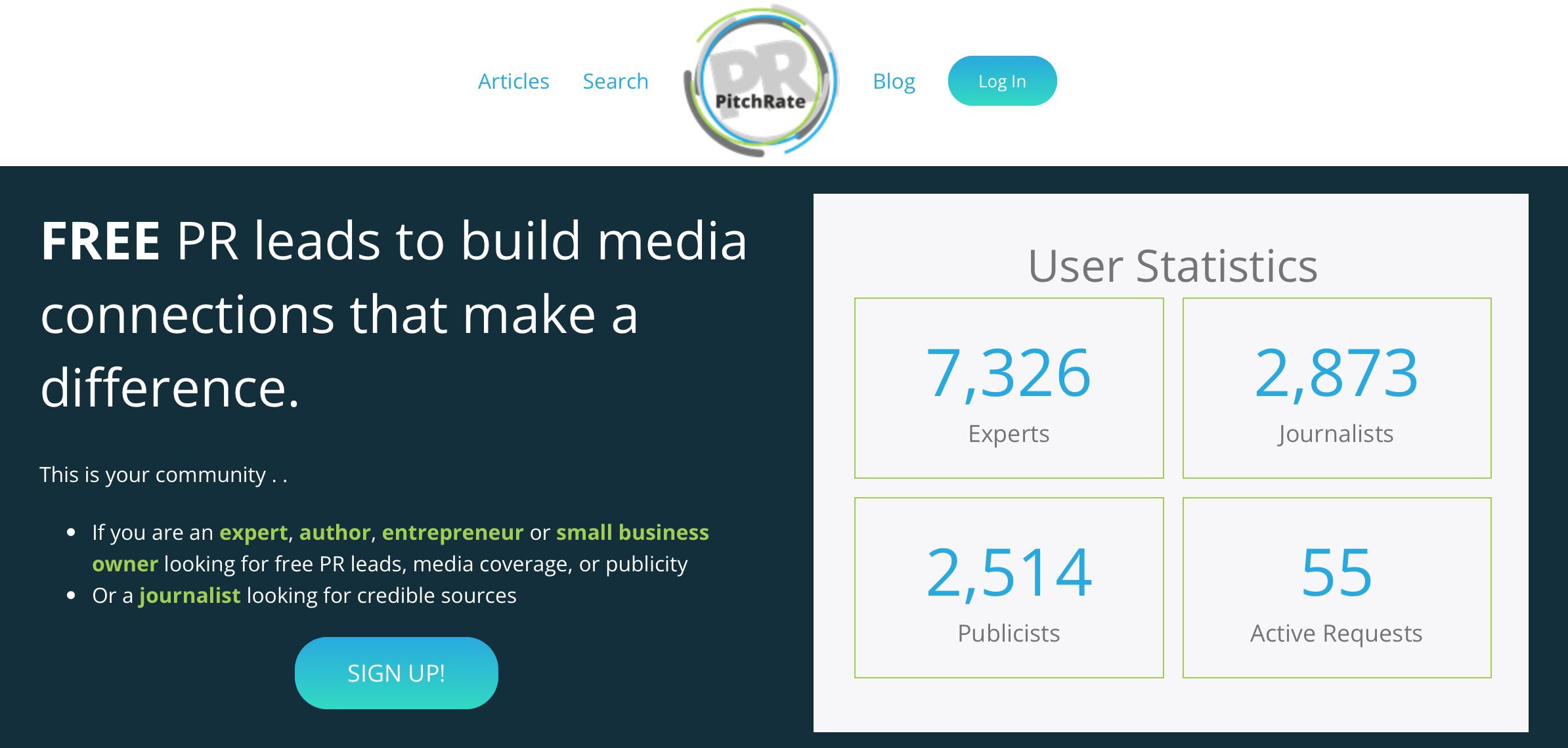 PitchRate is a free PR tool that connects journalists and highly rated experts. Useful for subject matter experts looking for free PR leads, media coverage, or publicity. Or journalists looking for credible sources. It scored 1% of the vote in my survey.