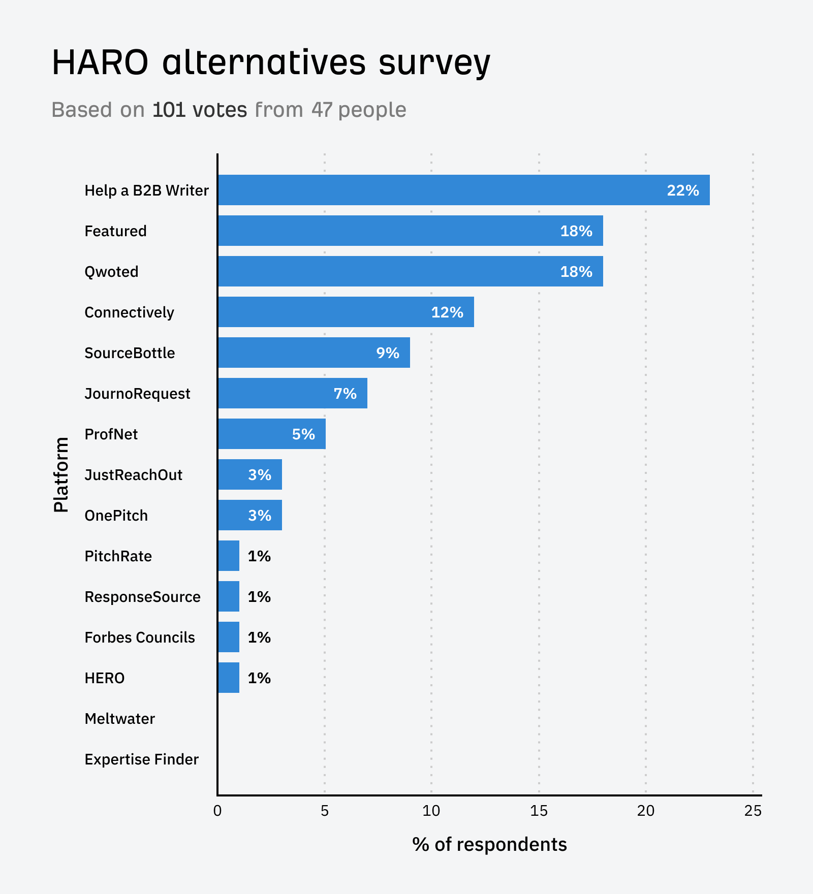 Help a B2B Writer was the #1 alternative platform respondents recommended. In my survey it got 22% of the vote.