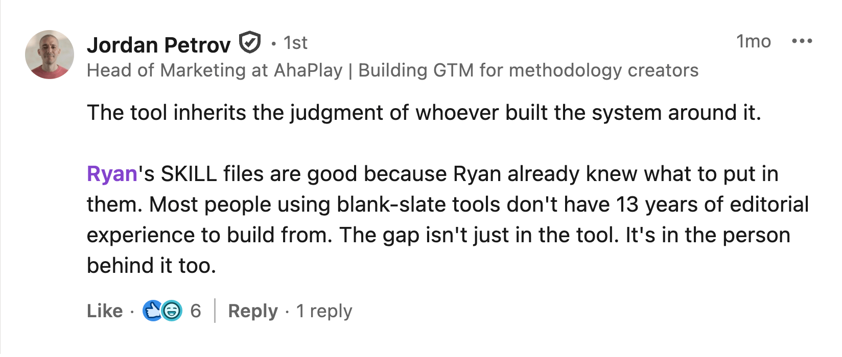 “Ryan’s SKILL files are good because Ryan already knew what to put in them. Most people using blank-slate tools don’t have 13 years of editorial experience to build from. The gap isn’t just in the tool. It’s in the person behind it too.”