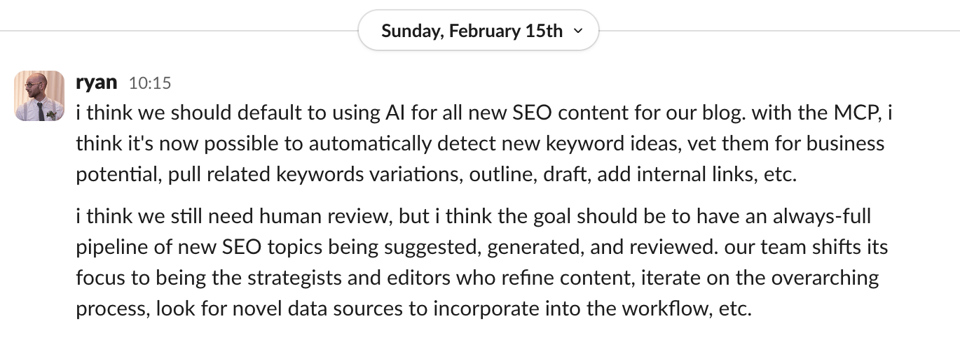 A big part of our previous AI content process was front-loading human input. My thesis is that small amounts of expert direction provided at the start of the content creation process are vastly more effective than lots of human editing at the end.