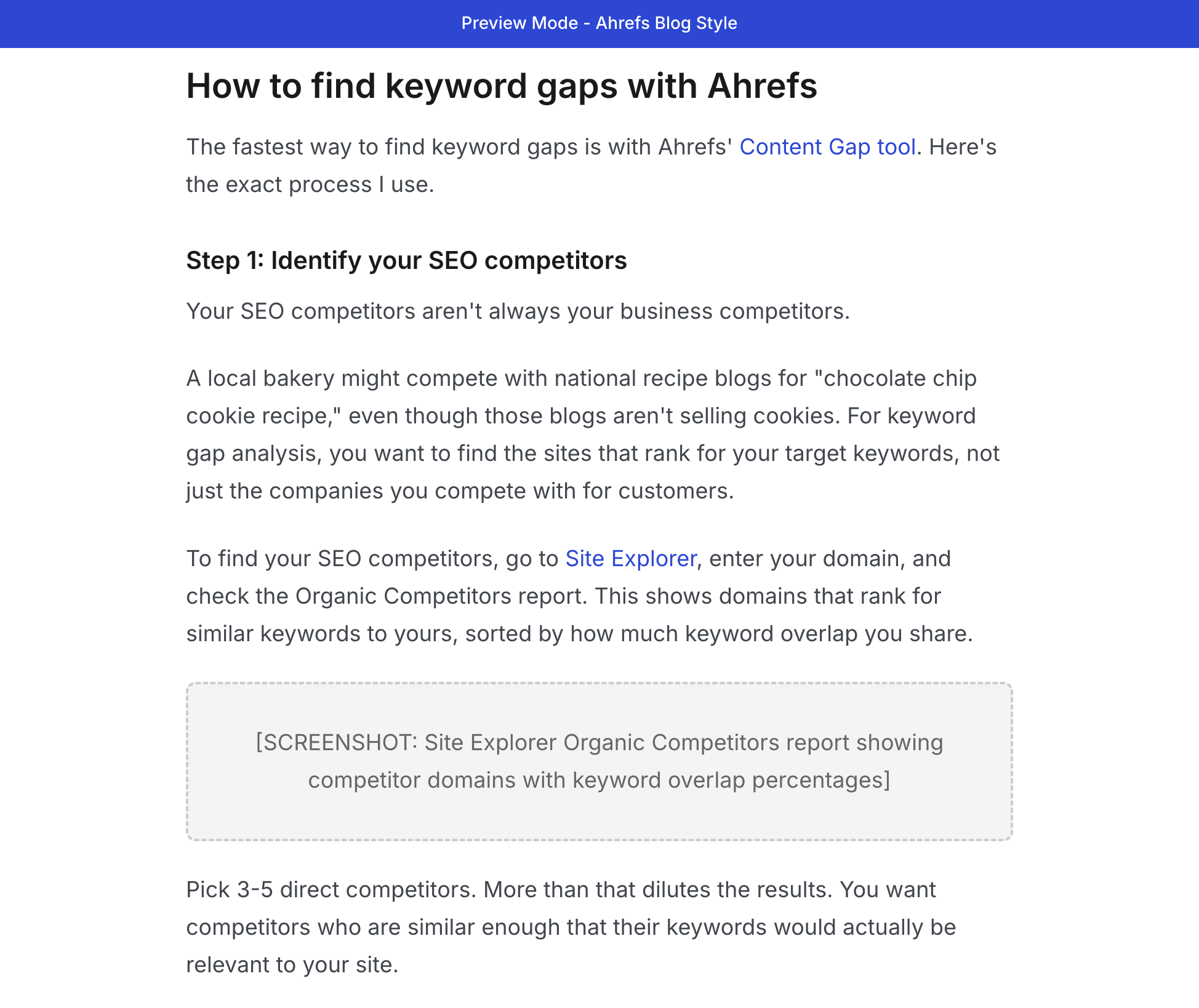 I read every word of every article that makes its way onto the Ahrefs blog. Reading Markdown files in VS Code isn’t my idea of a good time, so I use a simple skill that turns each generated article into a Ahrefs-style HTML preview that opens automatically in Chrome.