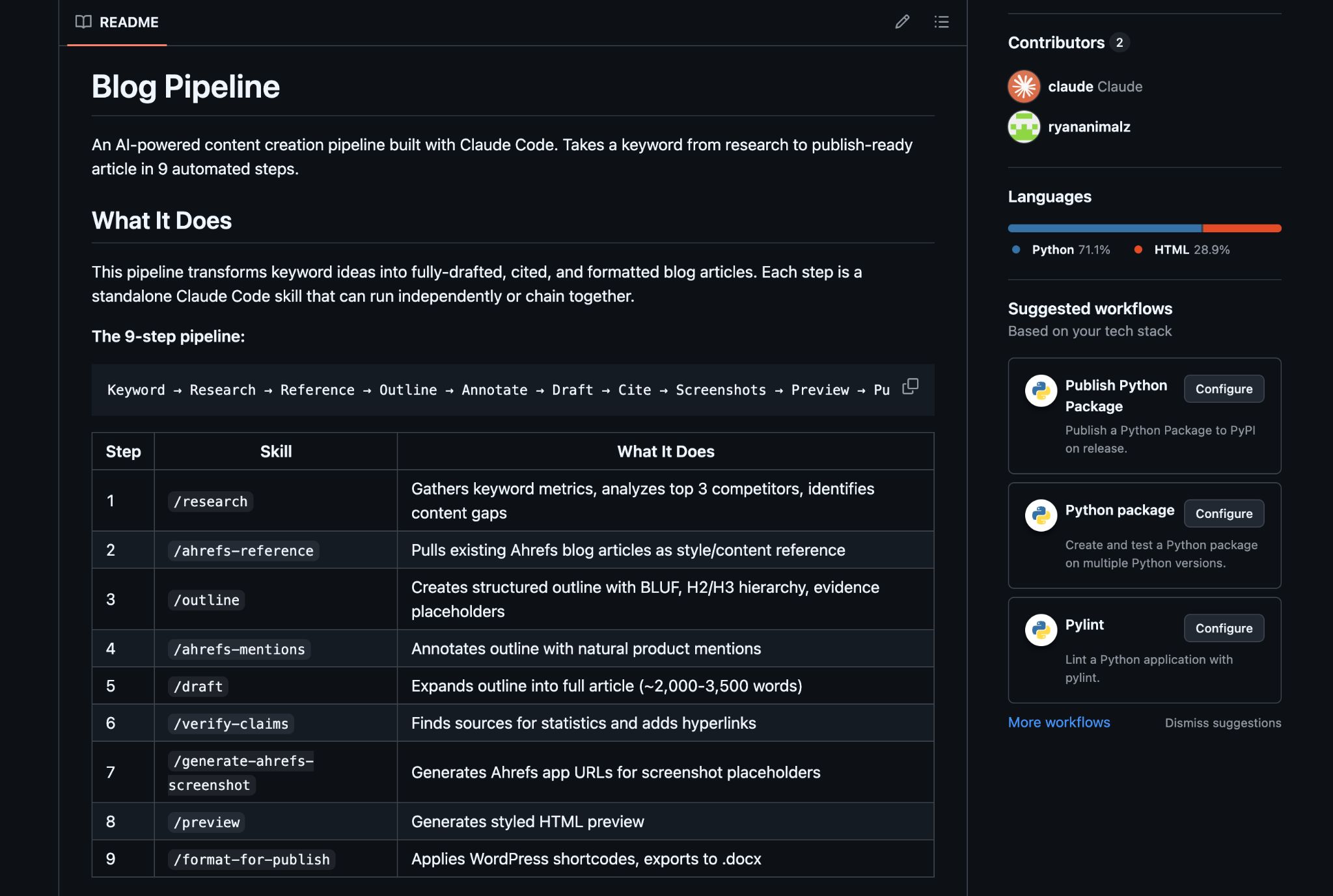 I want our AI content processes to reflect all our idiosyncrasies, so I encouraged the team to fork this repo and use Claude Code to modify it to their unique specifications, adding and removing steps of the process, changing the data sources and reports it uses, and learning from the style and voice of their own best articles.